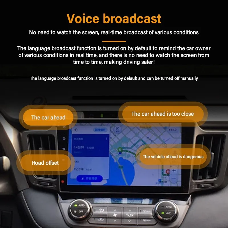 2. Функция помощи при вождении ADAS использует технологию динамической камеры для выравнивания линии вождения полосы движения во время вождения для реализации предупреждения о выезде полосы и голосовых подсказок для столкновения предыдущего транспортного средства.