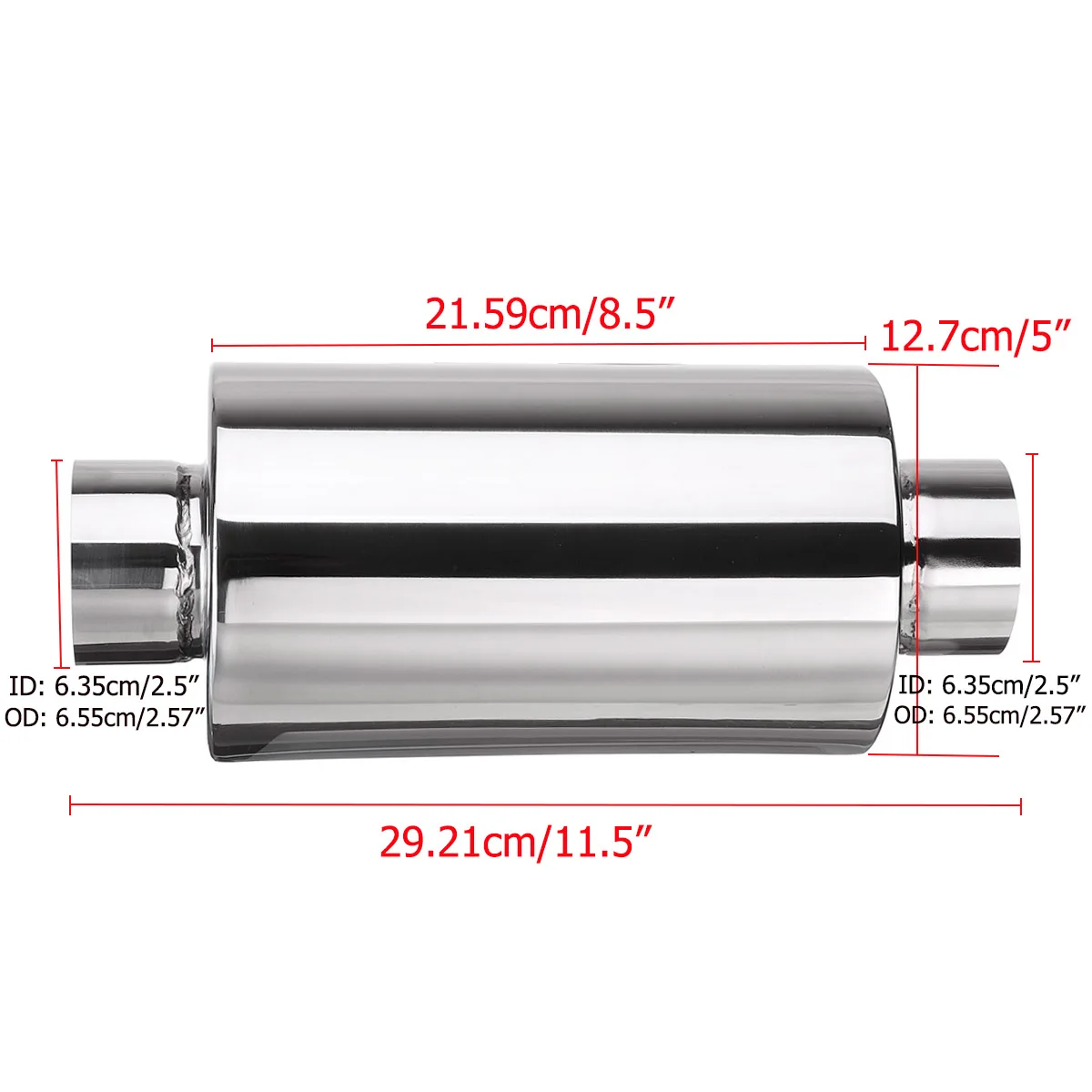 Спецификация:Название продукта: автомобильный глушительМатериал: нержавеющая сталь 304Цвет: хромВ общей сложности Длина: 29,21 см/11,5"На входе и выходе внутренняя Диаметр: 6,35 см/2,5"Наружный диаметр входа и выхода: 6,55 см/2,57"Коробка Диаметр: 12,7 см/5"Длина коробки: 21,59 см/8,5"Отделка поверхности: полированная