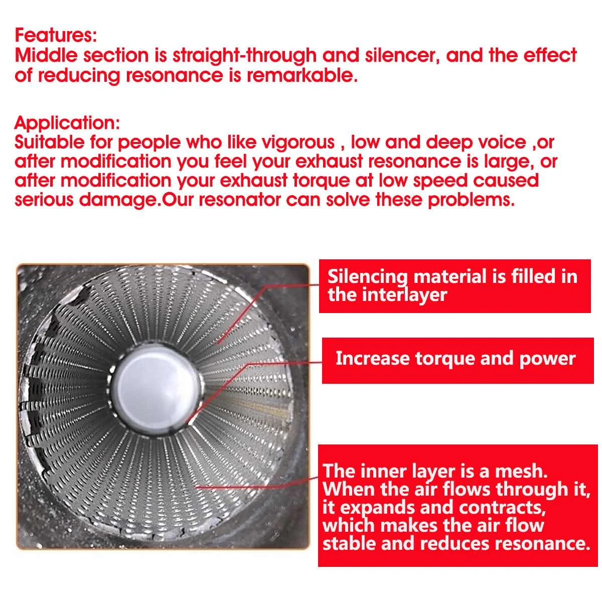 Применение:-Подходит для людей, которые любят энергичный, низкий и глубокий голос, или после модификации вы чувствуете, что ваш выхлопной резонанс большой, или после модификации вашего выхлопного момента на низкой скорости вызывает серьезные повреждения. Наш резонатор может решить эти проблемы.-Если у вашего автомобиля с рабочим объемом 2L или больше, который нуждается в глушитель выхлопных газов для тела диаметр барабана 12,7 см или больше