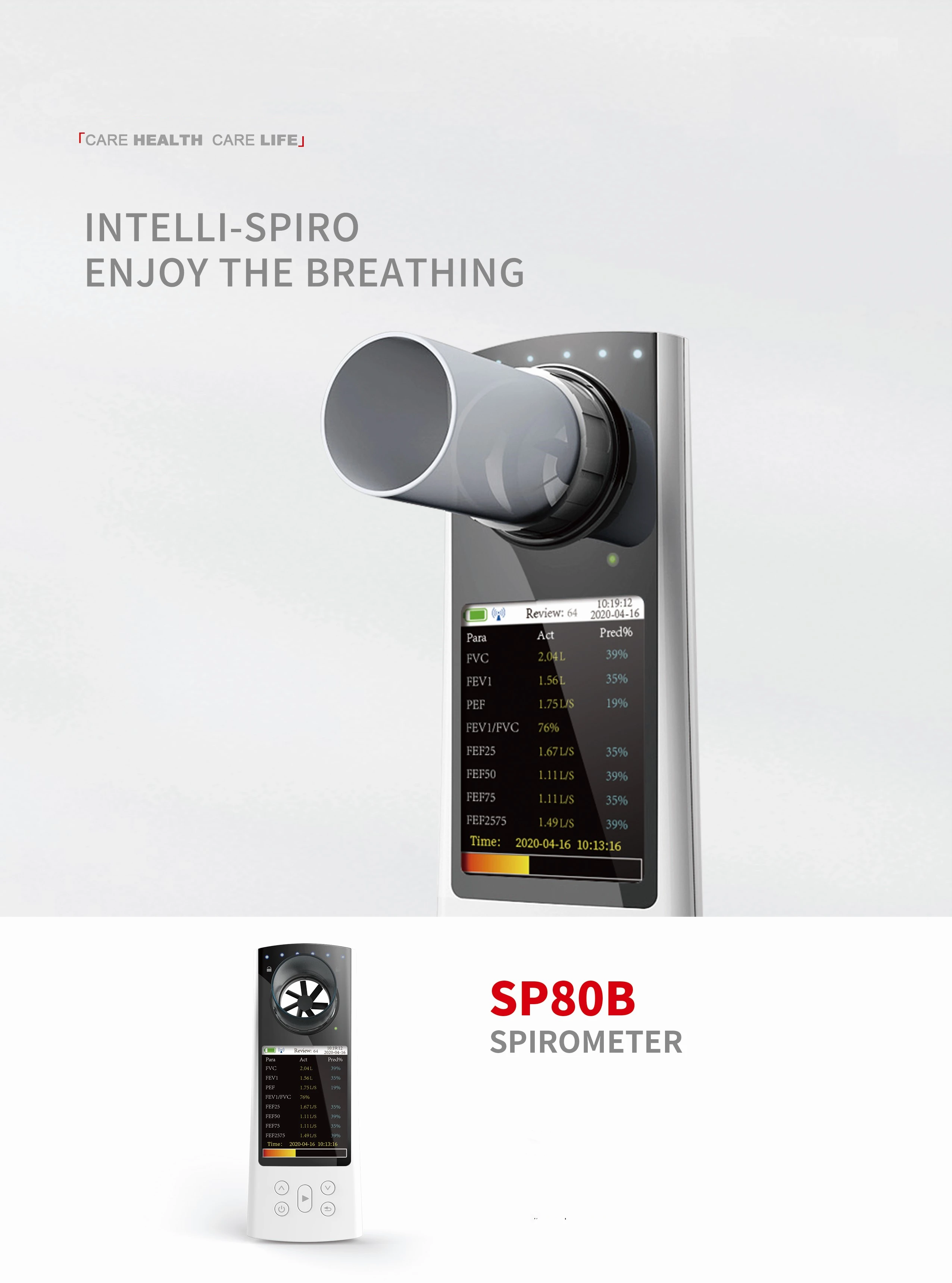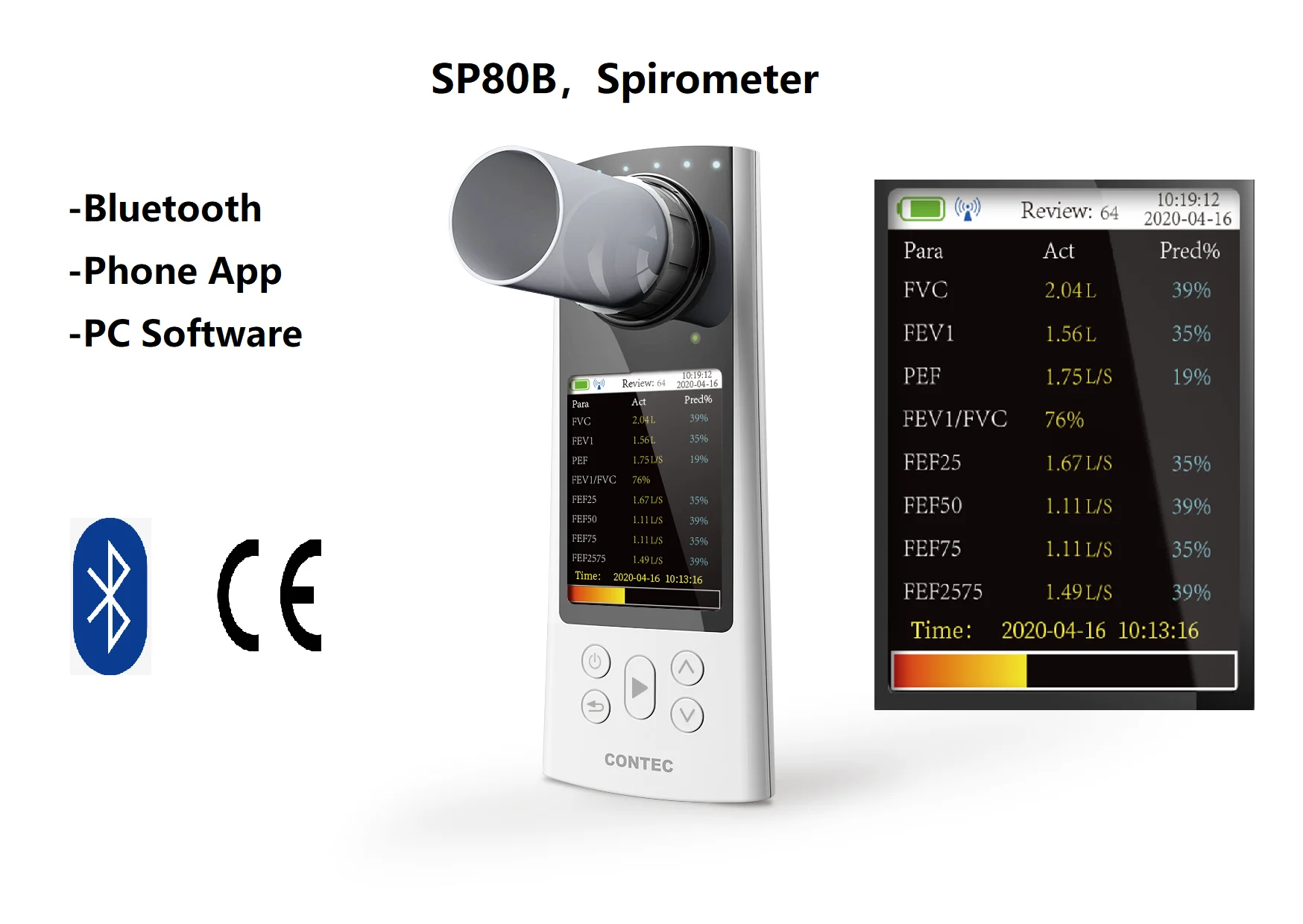 Спирометр-это ручное оборудование для проверки состояния легких, принимает режим приема инфракрасного сигнала для измерения предметов, связанных с FVC, и он применим для больниц, клиник, семьи для рутинного тестирования.
