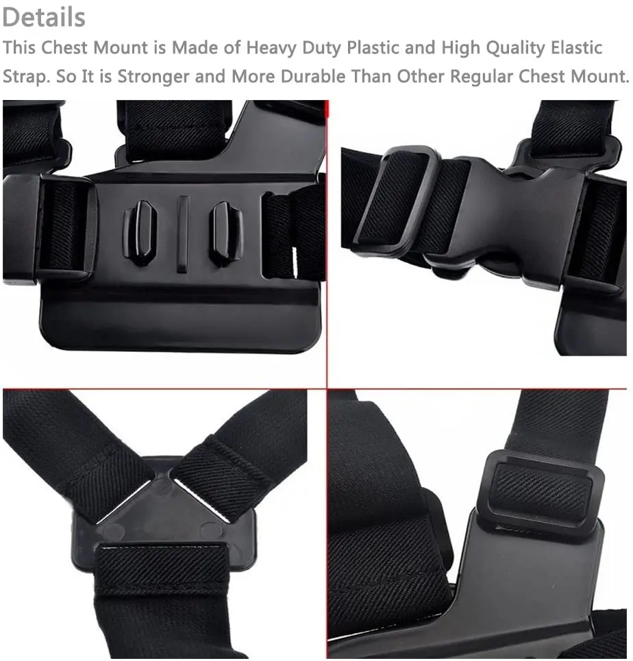 Нагрудный ремень:1) Регулируемый эластичный ремешок. Удобный, полностью регулируемый дизайн подходит для всех форм и размеров, включая Большие куртки2) Внутренняя подкладка из противоскользящего материала для хорошей носки, даже когда вы потеете3) эластичная лента, может вода, подходит для дайвинга или серфинга.4) дает вам "ниже, чем шлем" вид действия5) обеспечивает погружение6) Прочный светильник.7) Простота в эксплуатации и регулируемая конструкция для лучшего использованияЭто идеальный компаньон для вашей камеры во время путешествияРемешок на голову:1) эластичный регулируемый ремешок, один размер подходит всем2) Внутренняя подкладка из трех Противоскользящих материалов для хорошей носки, даже когда вы потеете.Больше подходит, более прочный, не легко свободно.