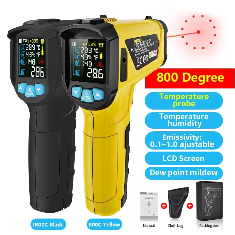 Примечание: батарея в комплект не входитМодель: 800C/IR02CДиапазон измерения-50 ~ 800 градусовДатчик температурыТемпература окружающей среды:-10 ~ 60CВлажность окружающей среды: 0% ~ 100% относительной влажностиТемпература плесени и точки росыD:S : 12:1Излучение: 0,1 ~ 100 регулируемаяДиапазон отклика: 8 ~ 14 мкмЛазерное позиционирование: 12 точечное кольцо, указывающее температуру чувствительной зоныЛазер:<1 мВт/630-670нм Уровень 2Время отклика:<0.5sАвтоматическое выключение: 30 секунд