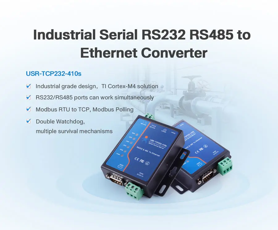Это последовательный rs485 и rs232 для Ethernet-сервера, используемый для прозрачной передачи данных. USR-TCP232-410S-это двойной последовательный сервер, который поддерживает rs232 и rs485, работающий одновременно. Он основан на Cortex-M4 решении, а внутренний последовательный сервер интегрирует стек протоколов TCP/IP. Кроме того, USR-TCP232-410S имеет функцию терминала питания.1. Индикатор ultiple для удобной отладки2. Терминал линии электропередачи для промышленного применения3.ARM kernel и TCP/IP стек протоколов4. Авто-Auto MDI/MDIX,RJ45 порт с 10/100 Мбит/с5.TCP сервер, TCP клиент, UDP,UDP сервер и HTTPD клиентский режим работы6. Два порта могут работать независимо одновременно7. Поддержка виртуального последовательного порта и предоставление соответствующего программного обеспечения USR-VCOM8. Скорость передачи данных от 600bps до 230,4 K bps; Проверьте Бит без, нечетных, четных, отметок и места9. Поддержка DNS и DHCP10. Предоставляем ПК TCP/IP SOCKET programming пример, VB,C + +,Delphi,Android,IOS11. Встроенный веб-сайт; Также можно настроить веб-страницу для пользователей12. Кнопка перезагрузки, одна кнопка для восстановления настроек по умолчанию13.RJ45 со звеном/индикатором данных светильник, встроенный изолирующий трансформатор и 2 кВ Электромагнитная изоляция14. Глобальный Уникальный MAC адрес, купленный у IEEE, пользователь может определить MAC адрес15. Поддержка обновления прошивки через сеть16. Поддержка keepalive, быстрое обнаружение мертвых звеньев17. Поддерживает учетную запись и пароль, может использоваться для входа на страницу и настройки сети18. Поддерживает один канал Websocket, реализует двунаправленный прозрачный transmisison bewteen webpage и серийный 019. Поддержка Modbus RTU в Modbus TCP20. Поддержка функции трансляции UDP, отправка и получение данных от всех ip в сети