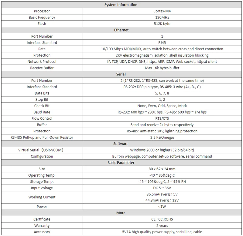 Входное напряжение: 5 ~ 36 В постоянного токаСертификат: CE, FCC, ROHSРазмер: 80x62x24 ммРабочая температура. : -40 ~ 85 °C (промышленность)Температура хранения. : -45 ~ 105 °C, 5 ~ 95% RH (без конденсации)Интерфейс: 1 * RS232 и 1 * RS485Сетевой протокол: IP, TCP, UDP, DHCP, DNS, HTTP, ARP,ICMP, Web socket, Httpd client