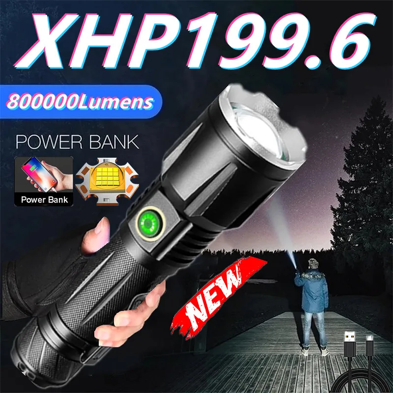 Мощный светодиодный фонарик XHP199.6, 18650 лм, 16 ядер, водонепроницаемый, IPX6, фонарь с зумом, 5 режимов, зарядка через USB, аккумулятор 26650