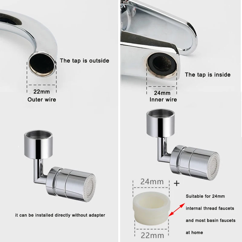 Мы поддерживаем прямые поставки, если вам нужно сотрудничать с нами для прямой доставки, пожалуйста, свяжитесь со мной.ОсобенностиДвухсторонний фильтр для смесителя 720 °, который можно поворачивать по желанию.Два режима воды можно получить при вращении,Что делает его более удобным для умойте лицо,Краску во рту и умывальник...Вращение на 720 градусовПоверните водную розетку на 720 градусов, которую можно регулировать под любым углом, чтобы облегчить очистку посуды, фруктов и овощей, а также мытье лица, полоскания и т. д. более удобно!Два режима выходаМягкий пузырьковый поток и сильный душ с распылителем.Безопасный и удобный дизайнФильтр брызг кран вводит воздух в поток воды, производя больший поток воды, который мягкий на ощупь и не брызгает. Этот продукт изготовлен из прочного материала, подходит для столовой, прачечной и двора, он используется для раковины, кухонного крана, смесителя для ванной комнаты и т. д.Простота установки(1). Внутренняя резьба составляет 22 мм, диаметр-круглый кран, можно установить непосредственно.(2). Внешняя резьба составляет 24 мм, диаметр-круглый кран, можно установить непосредственно.(3). Для смесителей с круглым носиком с внешним диаметром резьбы 22 мм или внутренним диаметром резьбы 24 мм, оба могут быть установлены непосредственно. Пожалуйста, купите адаптер M22 на M24.(4). Для 15-22 мм нерезьбовых или внешних резьбовых смесителей, пожалуйста, купите Универсальный адаптер.PS: Пожалуйста, измерьте размер крана дома перед покупкой, чтобы не устанавливать его после получения товара
