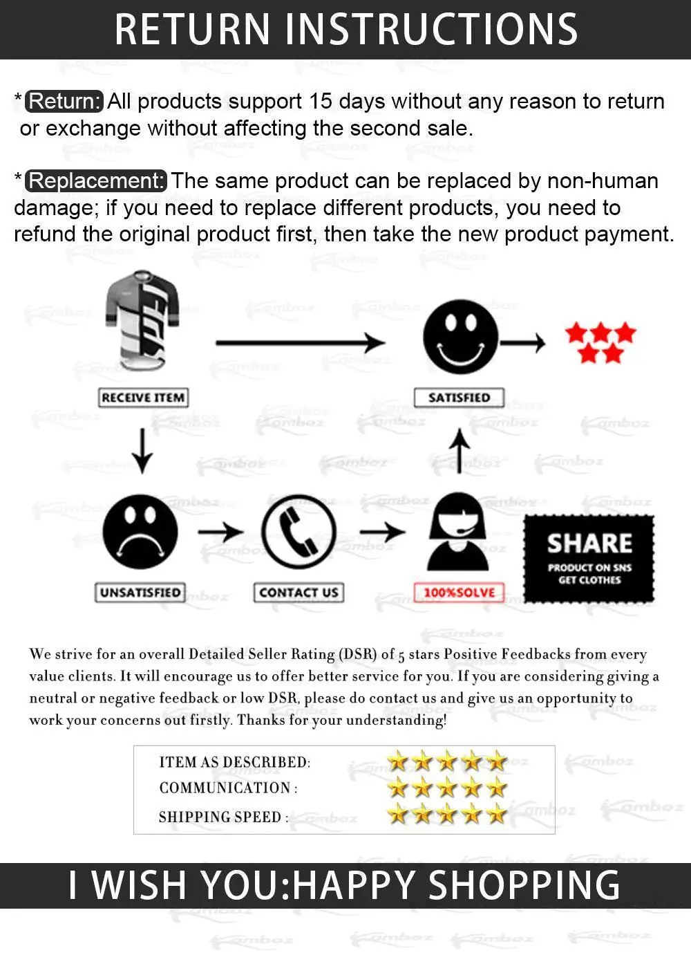 После того, как вы получили товар, пожалуйста, дайте нам положительный отзывы, если вы удовлетворены нашим качеством. Пожалуйста, укажите свой рост, вес, грудь. Что вы можете помочь другим клиентам выбрать правильный размер. Если вы не удовлетворены или недовольны, пожалуйста, свяжитесь с нами немедленно, прежде чем оставить отзывы, мы постараемся сделать все возможное, чтобы решить проблему, пока вы не удовлетворите.