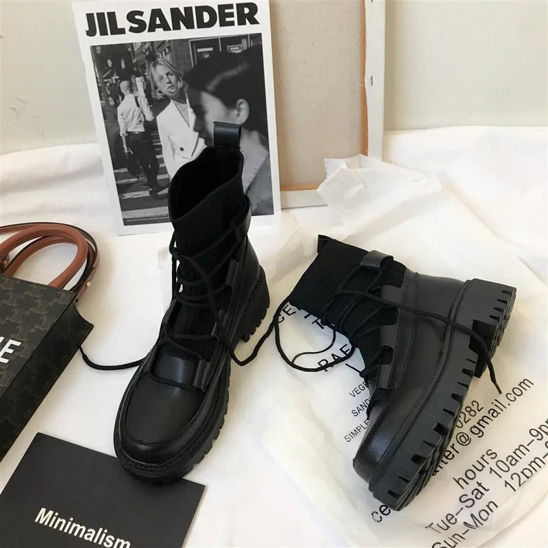 Женские сапоги до середины икры, Новинка осени-зимы 2021, женские эластичные сапоги на платформе для отдыха, черная женская готическая обувь на шнуровке