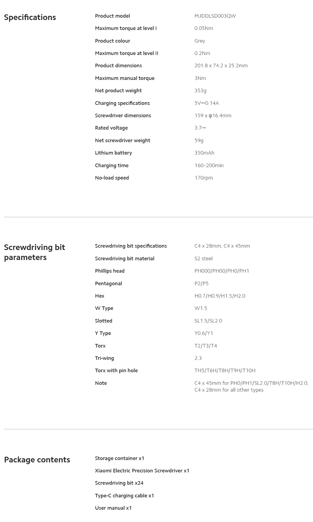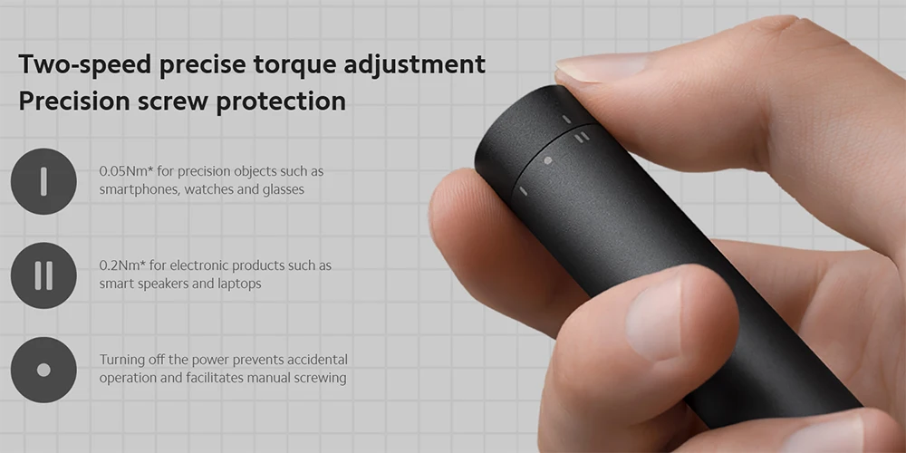 ● 2 шестерни точного регулирования крутящего момента. 0.05N · m используется для мобильных телефонов, часов, очков и других прецизионных объектов. 0.2N · m может использоваться в смарт-динамике, ноутбуке и других электронных продуктах.