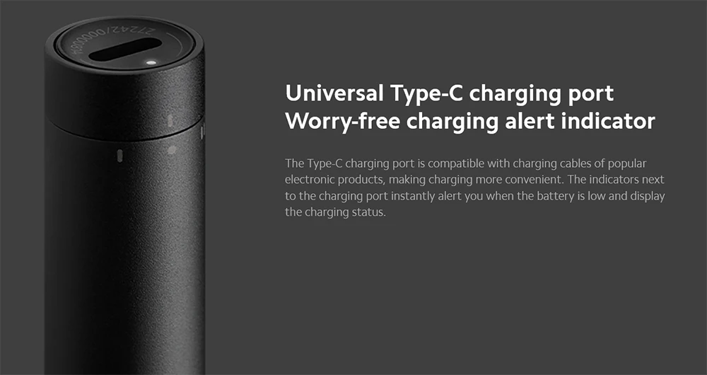 ● Универсальный зарядный интерфейс type-C. Светильник индикатора рядом с зарядным портом может обеспечить Предупреждение о низком заряде и своевременную подсказку состояния зарядки.