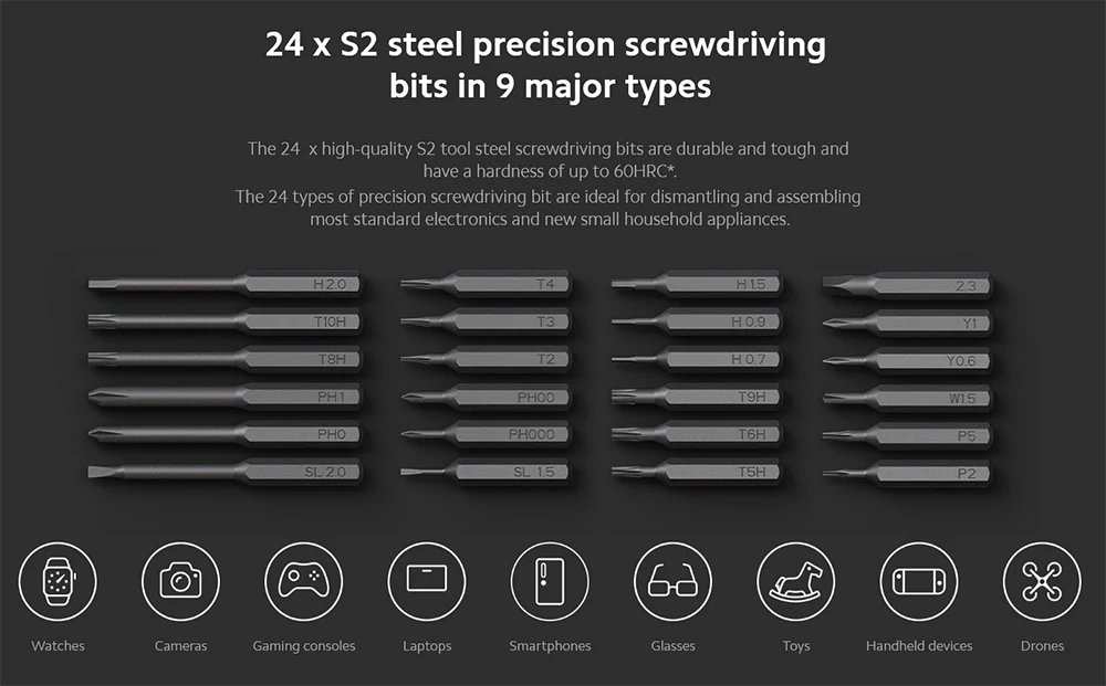 ● 9 видов, 24 шт S2 стальные прецизионные биты, твердость до 60HRC, жесткая и долговечная удовлетворяет потребности основных электронных продуктов и новых мелких бытовых приборов разборки и сборки.