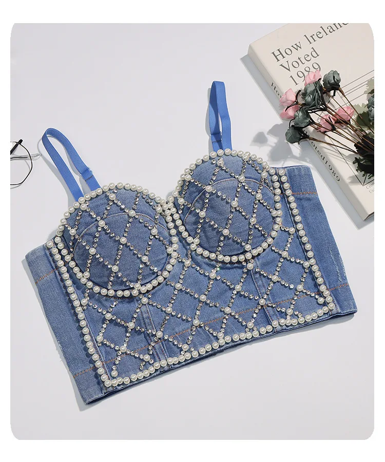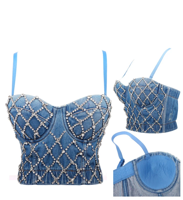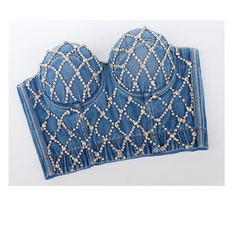 Укороченный корсет с блестками Стразы, топы из джинсовой ткани с бриллиантами, женский сексуальный корсет Y2K E Girl, готическое бюстье, майка-топ, одежда для вечевечерние НКИ и клуба