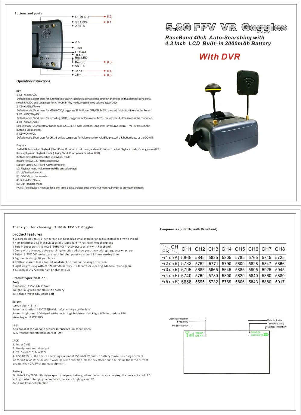 Особенности:1. Высокая яркость 4,3 дюймов ЖК-дисплей специально в курсе событий с видом от первого лица или лазерной обрезки модели самолета2. Встроенный супер чувствительность детектора 5,8 ГГц 40ch приемник, особенно с гоночными ремешка.3. Поставляется с расширенной функцией автоматического поиска и показывает вам частоту работы на экране4. Легкий, встроенный 3,7 V / 2000mA батареи, каждая Полная зарядка оживить около 2 часов рабочего времени5. Эргономичный дизайн адаптируется под ваши лицаОписание:1. Этот FPV очки поставляется с 4,3 inch 480 * 272px HD высокой яркости ЖК-дисплей2. Встроенный 40CH 5,8G приемник, совместимый с большинством передатчиков FPV 5,8G на рынке.3. 92% прозрачные линзы, без искажений, без фокусировки на экранеСпецификация:Размер корпуса: CNT размер. 145*156*112 ммВес: 291 гС батареей 2hr 2000mAh, G.W. 608 гРемень: трехполосный регулируемый ременьЭкранРазмер экрана: 4,3 дюймовРазрешение экрана: 480*272 (без размытия после увеличения линзы)Яркость экрана; 300 кд/м2 со специальной высокой яркостью заднего вида Угол обзора: 12 часовОбъектив2.8x увеличение видео, чтобы получить интенсивный feel-in-there video92 % прозрачной скорости не искажать светДжек1. Входной CVBS2. Звук наушников3. Tf-карта (C10) Max32G4. USB DC5V в прибор рабочий ток 550mA @ 5V, встроенный аккумулятор Максимальный заряд currentof 750mA @ 5V;В том случае, если устройство работает при зарядке, Обратите, пожалуйста, внимание на выбор Номинальная currgreater чем 2A/5В зарядному устройству.Аккумулятор:Built-in3.7V/2000 мАч высокоемкий полимерный аккумулятор, когда аккумулятор заряжается, devicetheredlwlllight при зарядкеЗавершены, здесь яркие зеленые.Выбор диапазона и каналаИнформация о посылка:Посылка Размеры: 175x185x120 мм/6,89x7,28x4,72 вВес посылка: 591 г/1,3ibПосылка в подарочной коробкеПосылка:1 X очки1 x Грибная антенна1 x панельная антеннаРуководство пользователя на английском языке-1 шт.1 x коробка