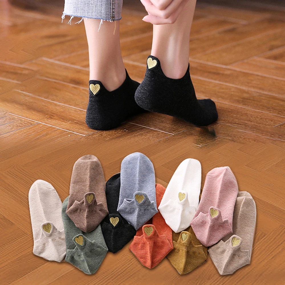 Носки-лодочки женские с вышивкой, хлопковые Цветные Милые повседневные смешные носки до щиколотки с вышивкой сердечком, на каблуке, на весну