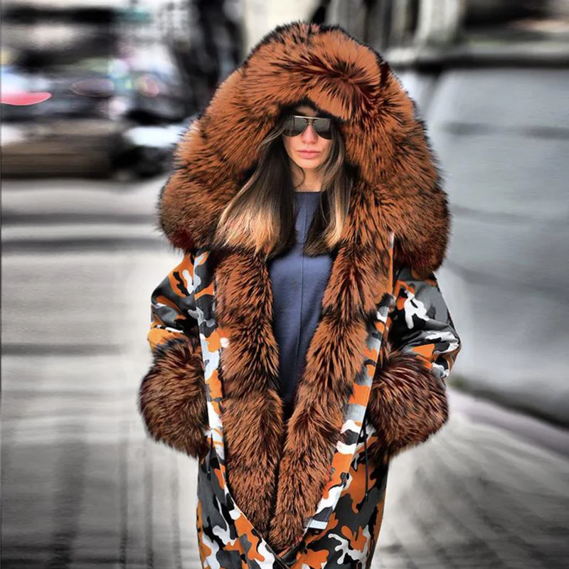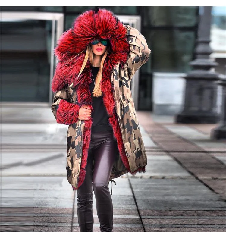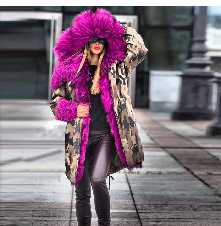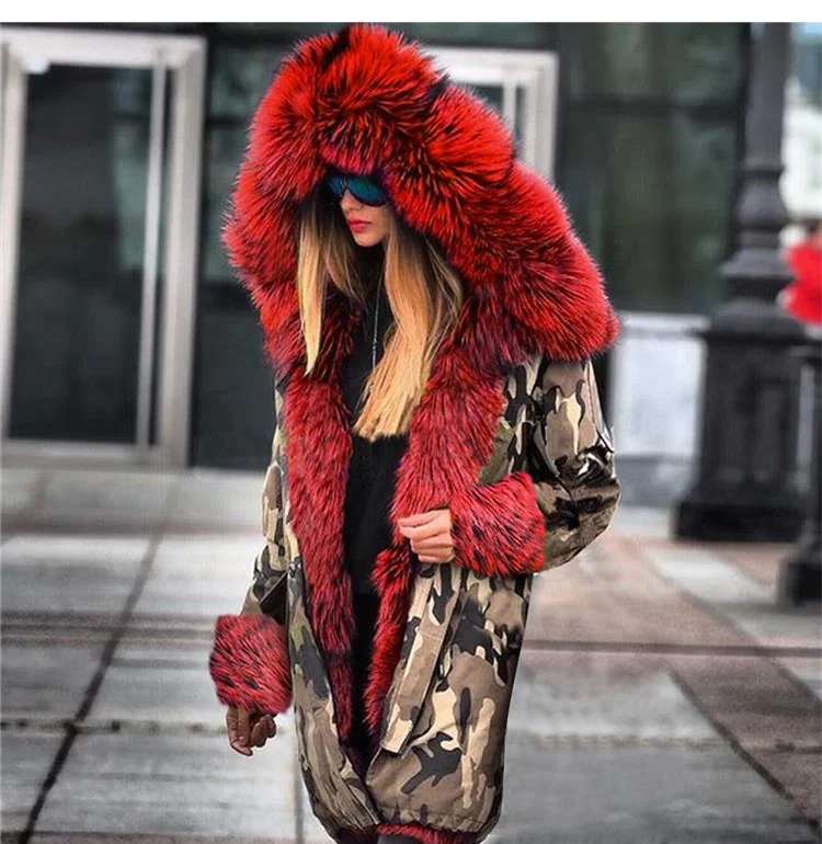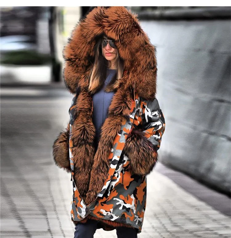 Парка из искусственного меха, длинная камуфляжная шапка в европейск...