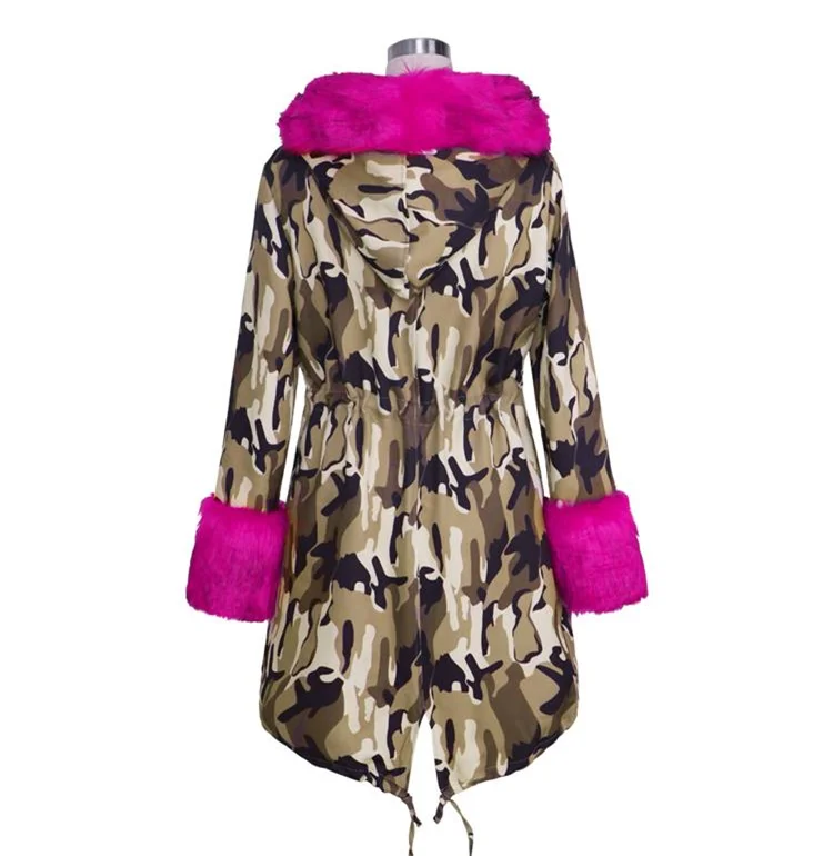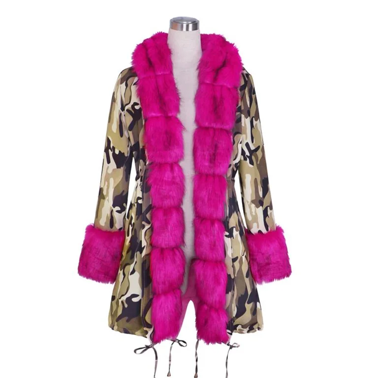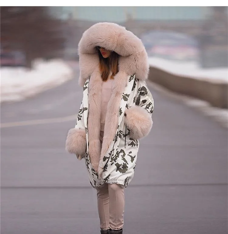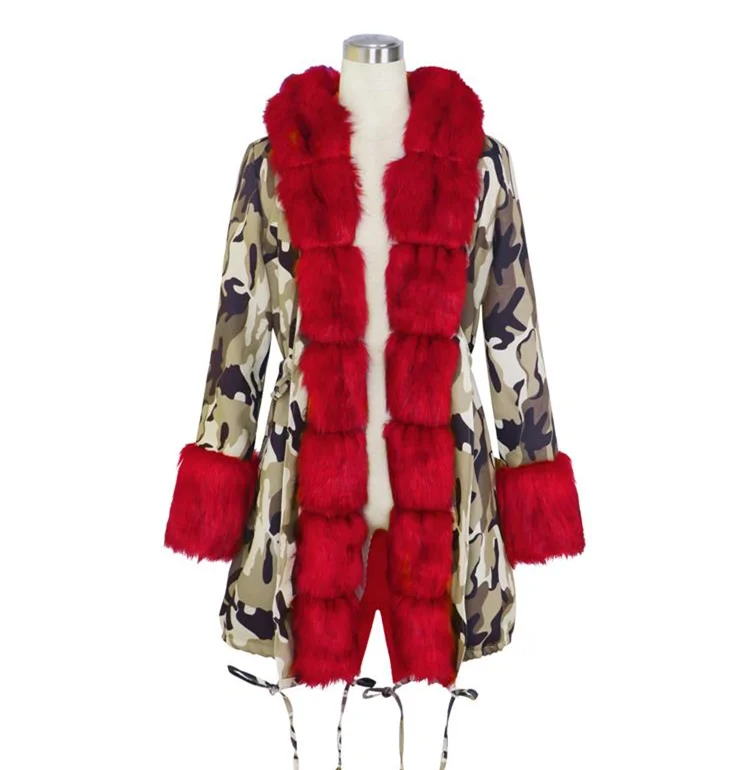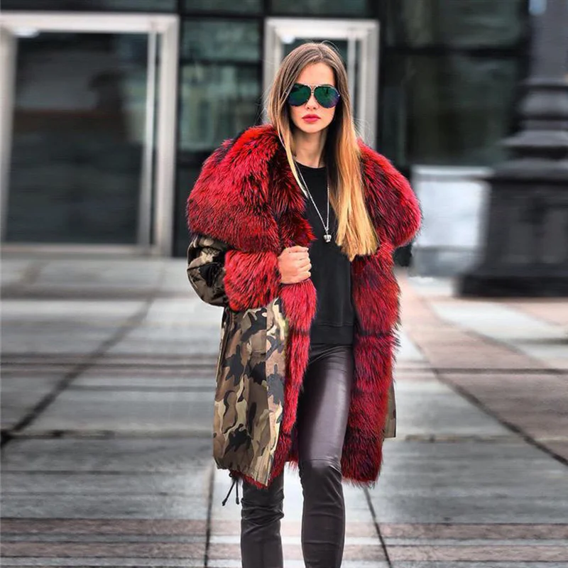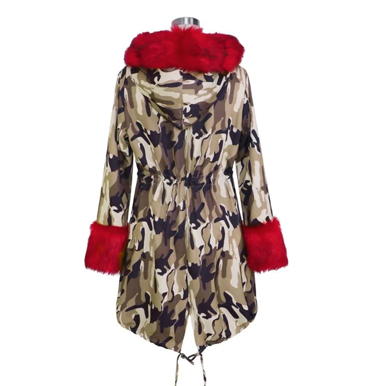 Парка из искусственного меха, длинная камуфляжная шапка в европейск...
