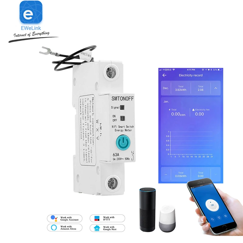 EWelink однофазный Din-рейка Wi-Fi умный измеритель энергии, расход...