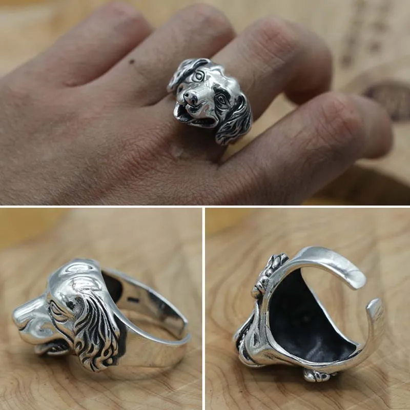 Кольцо мужское регулируемое в винтажном стиле, серебряное, с собако...