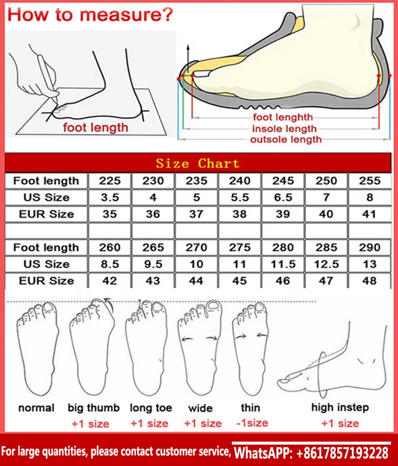 Здравствуйте: Дорогой друг! Добро пожаловать в наш магазин, товары, которые вам нравятся (коллекционные и торговые тележки могут получать больше скидок)Мы удовлетворяем потребности покупателей благодаря хорошему обслуживанию и высокому качеству продукции. Качество продукции абсолютно гарантировано. Клиенты-наш бог, и мы будем честны друг с другом. Здесь я совершаю покупки, чтобы обеспечить ваше удовлетворение. Вы будете покупать хорошие продукты и хорошее обслуживание по разумной цене. Счастливые покупки!Как выбрать правильный размерИзмерьте длину голой стопы и купите ее в китайских размерах. Если длина стопы 26,8 см, выберите/CN 45. Если ваша стопа более толстая или широкая, мы рекомендуем вам выбрать больший размер.Если длина стопы составляет 220-225 мм, пожалуйста, выберите/CN 36Если длина стопы 226-230 мм, пожалуйста, выберите/CN 37Если длина стопы 231-235 мм, пожалуйста, выберите/CN 38Если длина стопы 236-240 мм, пожалуйста, выберите/CN 39Если длина стопы 241-245 мм, пожалуйста, выберите/CN 40Если длина стопы составляет 246-250 мм, пожалуйста, выберите/CN 41Если длина стопы составляет 251-255 мм, пожалуйста, выберите/CN 42Если длина стопы 256-260 мм, пожалуйста, выберите/CN 43Если длина стопы 261-265 мм, пожалуйста, выберите/CN 44Если длина стопы 266-270 мм, пожалуйста, выберите/CN 45Если длина стопы 271-275 мм, пожалуйста, выберите/CN 46Если длина стопы 276-280 мм, пожалуйста, выберите/CN 47Если длина стопы 281-285 мм, пожалуйста, выберите/CN 48Если вы не уверены в размере, пожалуйста, свяжитесь со службой поддержки клиентовДля большого количества, пожалуйста, свяжитесь с продавцом WhatsAPP: + 8617857193228