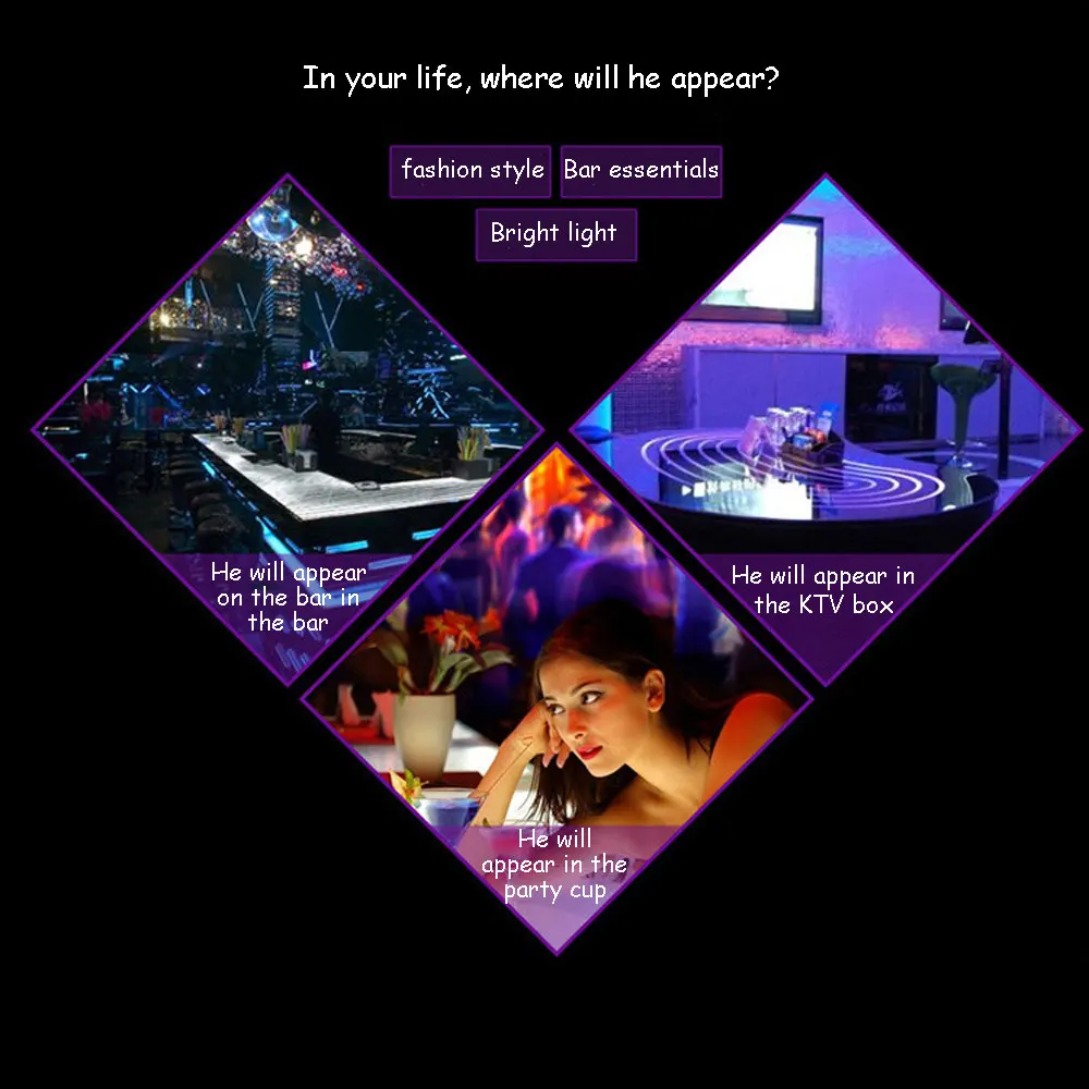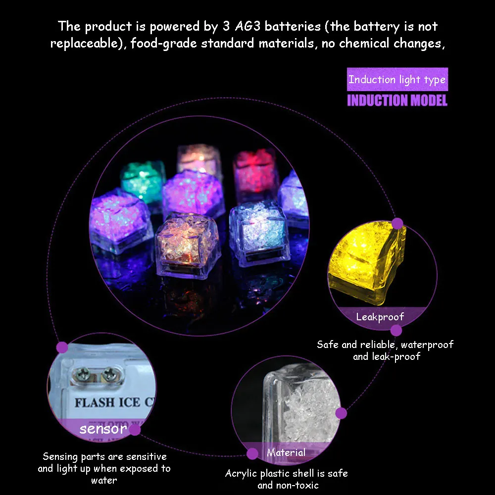 · Продукт использует Светящиеся Кубики льда, состоящие из PS материалов и электронных компонентов, которые имеют свойство быть яркими при попадании в воду (жидкая индукция), и внешний вид похож на настоящие кубики льда. Внутри продукта есть светодиодный источник электроники, без химических изменений, безвредный и может быть помещен во все виды напитков, чтобы добавить романтическую и загадочную атмосферу. Он широко используется в различных праздничных мероприятиях или в гостиничных барах и других местах.· Режим переключения: индукция жидкости, светильник при касании водой· Как использовать: Положите Светящиеся Кубики льда в воду, она автоматически блестит; После использования протрите его сухой тканью и поместите в сухое место для следующего использования.Примечание: Не глотайте и не помещайте его в слишком горячий напиток.· Напоминание: вы можете пить алкоголь с кубиками льда, но вы не можете добавить напитки, которые слишком горячие. Аккумулятор не заменяется. Выньте кубики льда из жидкости, пожалуйста, высушите фоточувствительные пятна как можно скорее. Он перестанет светиться без энергопотребления. Конечно, он не должен быть в жидкости, чтобы быть ярким. Он также будет ярким, если вы держите его под рукой. Описание характеристики: светильник, излучающий лед, состоит из PS материала и электронных компонентов, имеет свойство быть ярким при попадании в воду. (Индукция жидкости), внешний вид похож на настоящие кубики льда. Продукт работает от батареи, не изменяется химически, безвреден и может быть помещен во все виды напитков, чтобы добавить романтическую и загадочную атмосферу. Он широко используется в различных праздничных мероприятиях или в гостиничных барах и других местах.