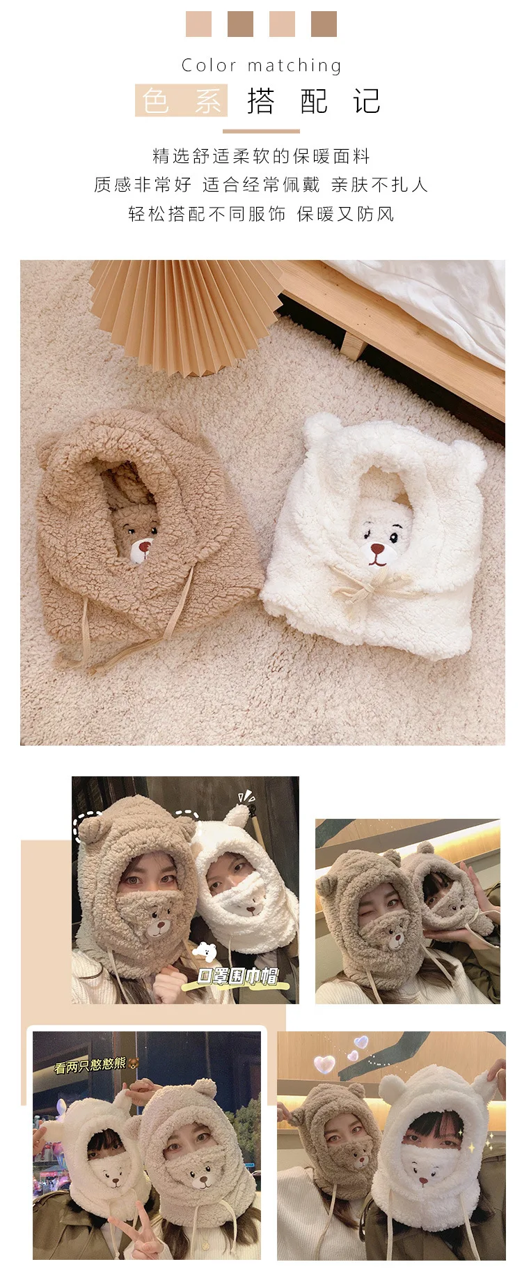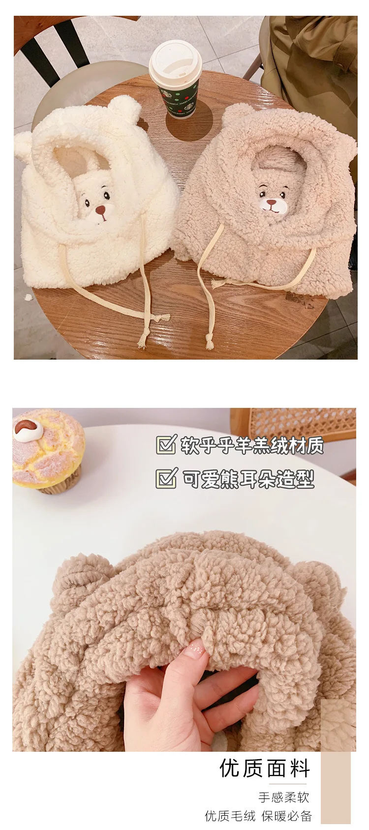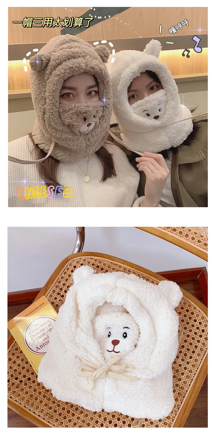 Зимний милый мультяшный медведь овечья плюшевая теплая однотонная фотошарф набор маска утолщенная Защитная шапка для ушей женский новогодний подарок для девочки