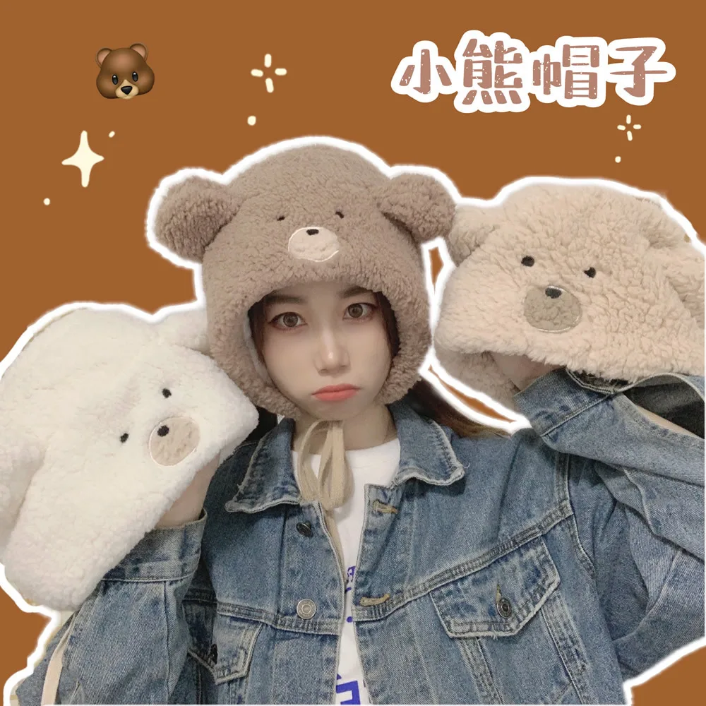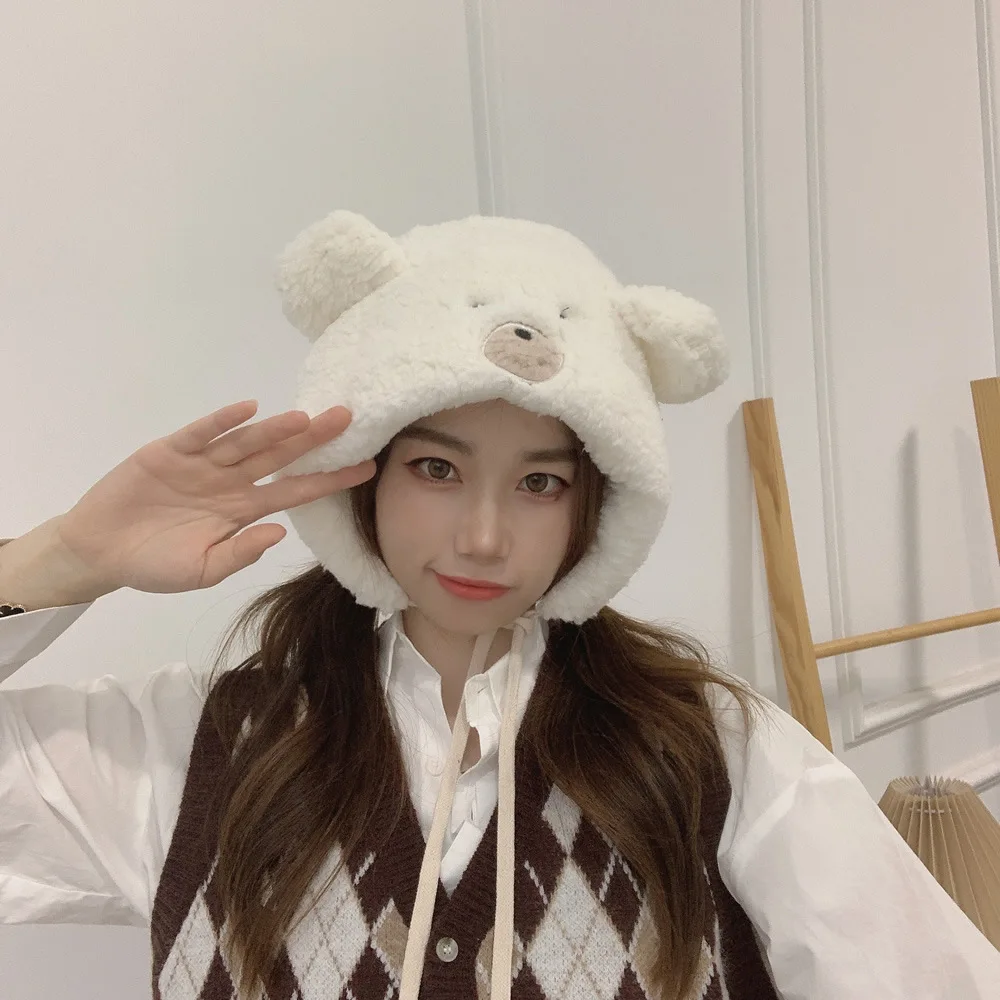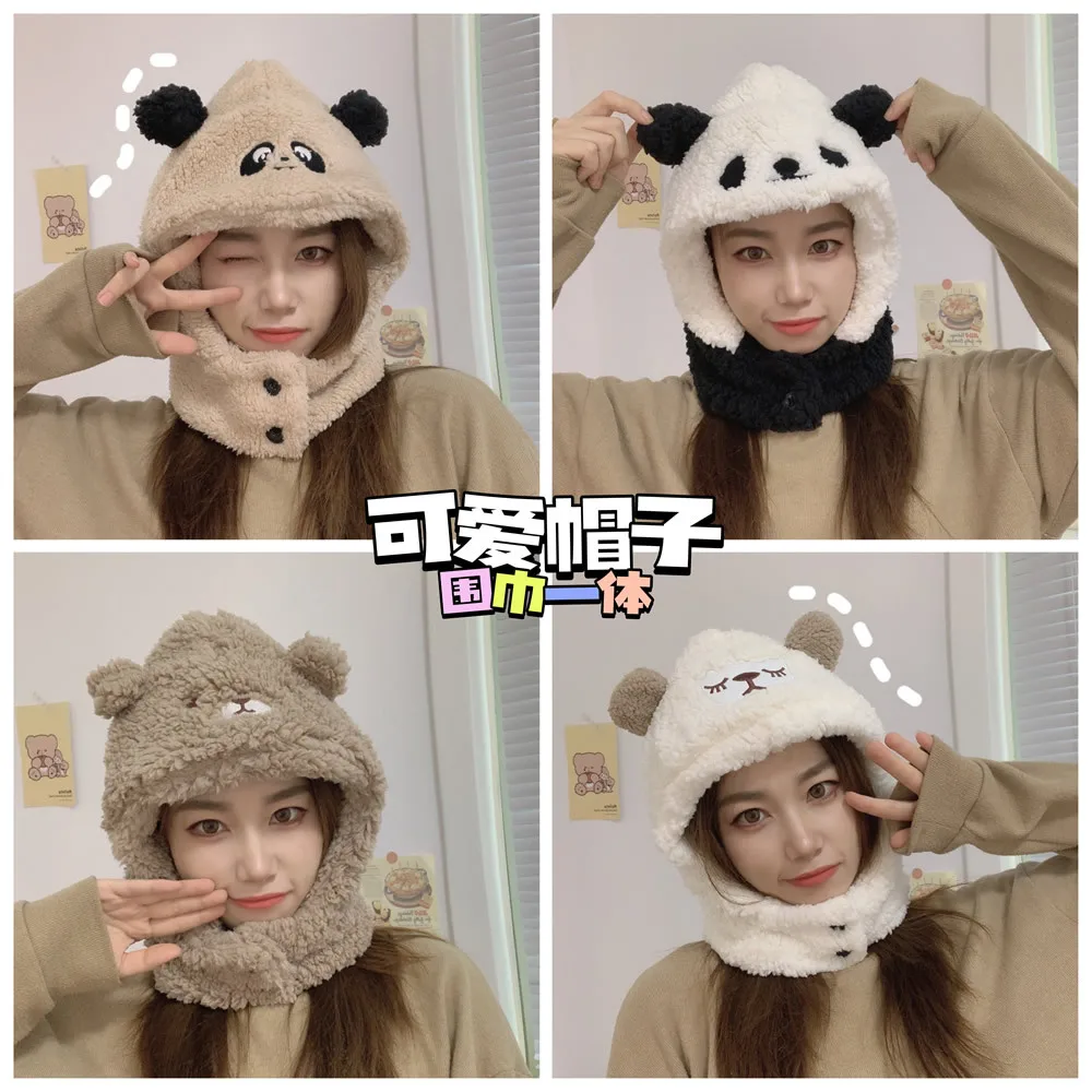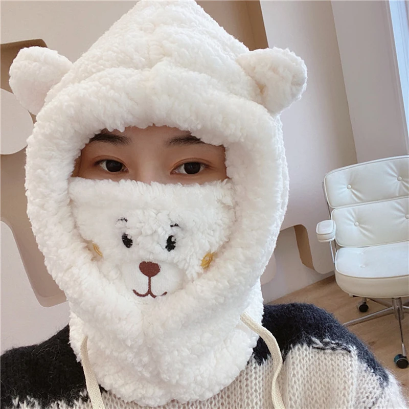 Зимний милый мультяшный медведь овечья плюшевая теплая однотонная фотошарф набор маска утолщенная Защитная шапка для ушей женский новогодний подарок для девочки