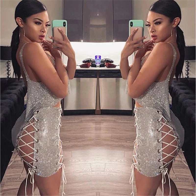 Кроп-топ Y2k Bling Стразы Вечерние, модный топ на бретельках с открытой спиной и блестками, пикантная мини-юбка для ночного клуба