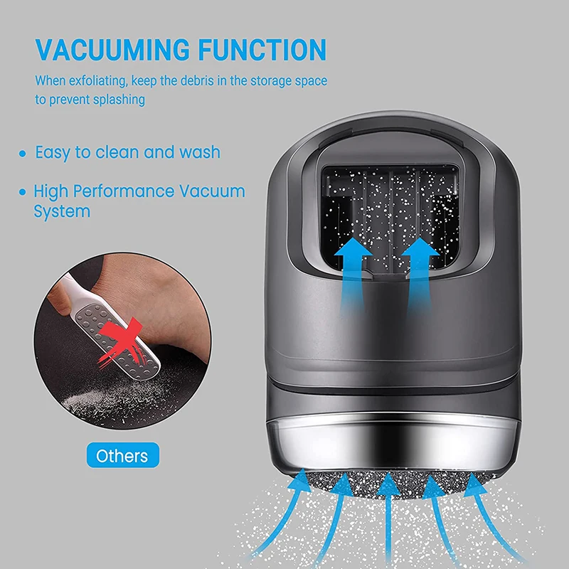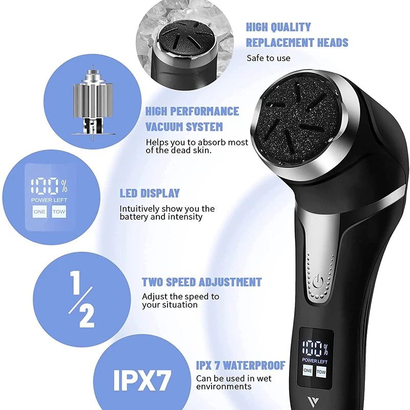 Высококачественные сменные головкиБезопасно для использованияВысокопроизводительная вакуумная системаПомогает поглощать большую часть омертвевшей кожи.Светодиодный дисплейИнтуитивно показывает вам аккумулятор и интенсивностьРегулировка двух скоростейНастройте скорость в соответствии с вашей ситуациейIPX 7 водонепроницаемыйМожет использоваться во влажной среде