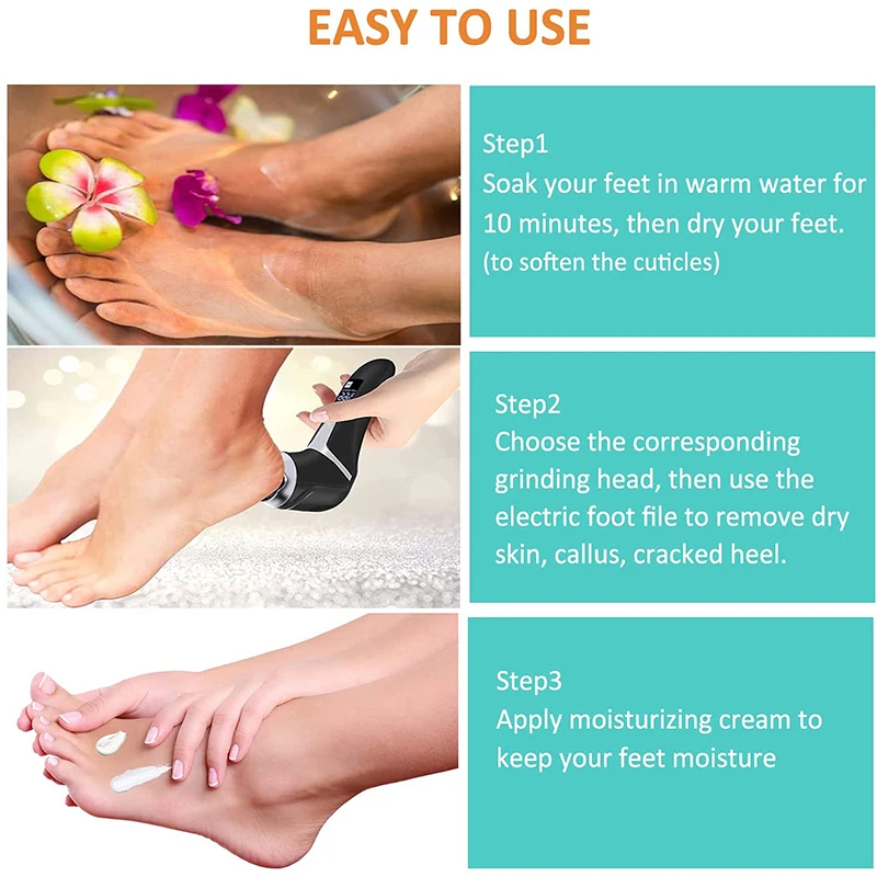 Шаг 1: Замочите ноги в теплой воде в течение 10 минут, а затем высушите ноги. (чтобы смягчить кутикулы)Шаг 2: выберите соответствующую шлифовальную головку, затем используйте электрическую пилку для удаления сухой кожи, мозолей, треснутой пятки.Шаг 3: нанесите увлажняющий крем, чтобы ваши ноги были увлажнены