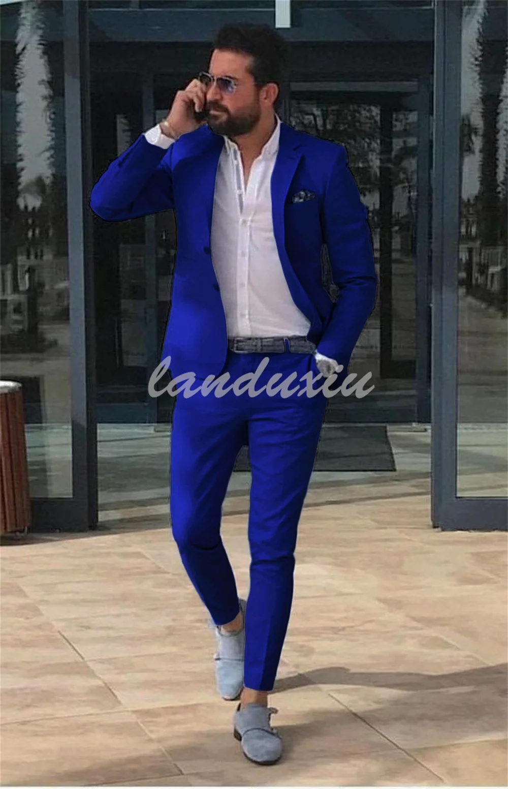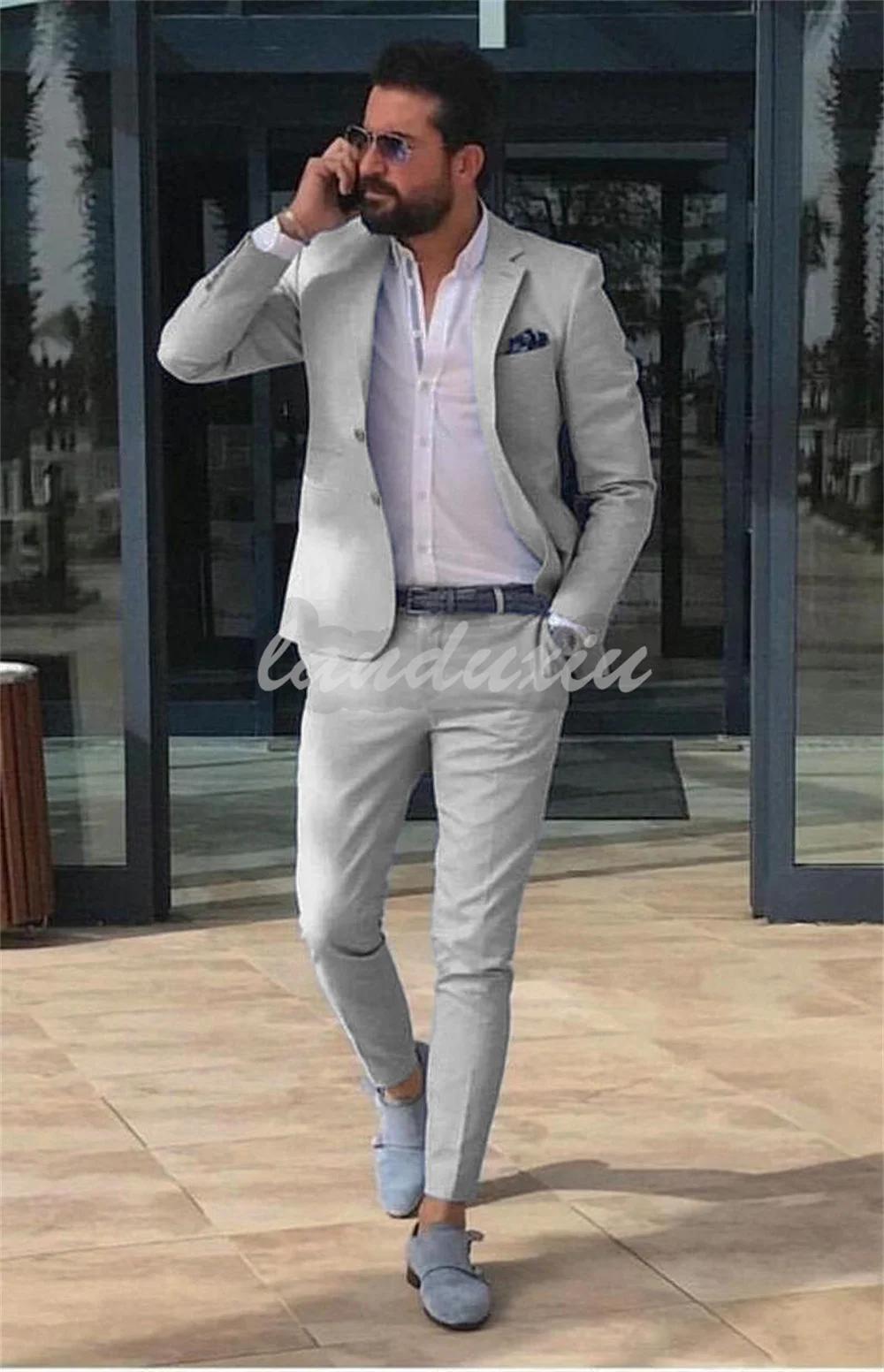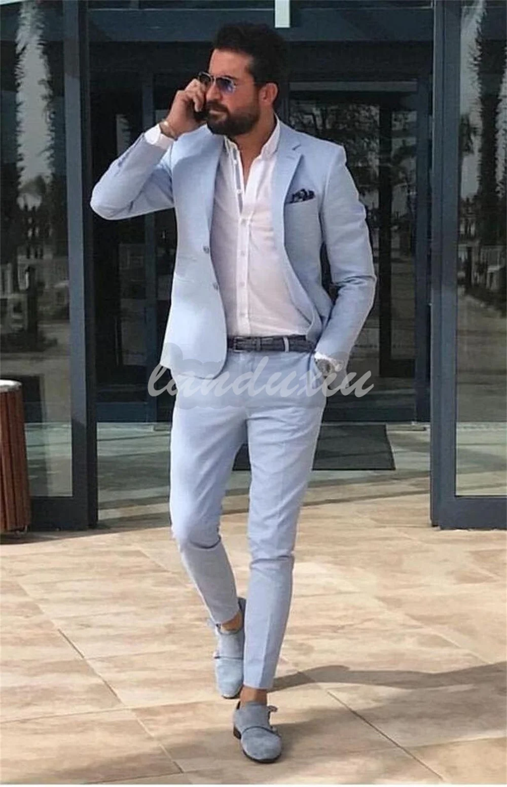 Мужской костюм небесно-голубого цвета, мужские костюмы из 2 предметов, пляжные смокинги для женихов, Свадебные смокинги для мужчин, официальный костюм для выпускного вечера с вырезом, пиджак и брюки