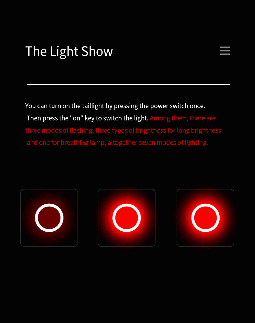COB светодиодный.1. Полностью 6061 шасси из алюминиевого сплава.2. Автоматическое включение/выключение в зависимости от интенсивности и движения светильник.3. Автоматическое переключение в режим сна для экономии энергии.4. Крепление рейки сиденья5,4 Режимы вспышки.6,20 часов + время работы.Литий-ионная перезаряжаемая батарея емкостью 7,400 мАч.8.USB зарядка.9. Индикатор заряда батареи (мигает каждые 6 секунд)10. Компактный и легкий дизайн (55 г).11. Водонепроницаемость IPx6.