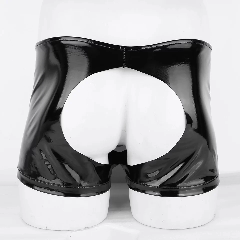 Мужские сексуальные кожаные короткие брюки с открытой промежностью для секса Эротические блестящие Трусики ниже промежности из лакированной кожи Фетиш боксеры Горячие порно брюки сексуальные