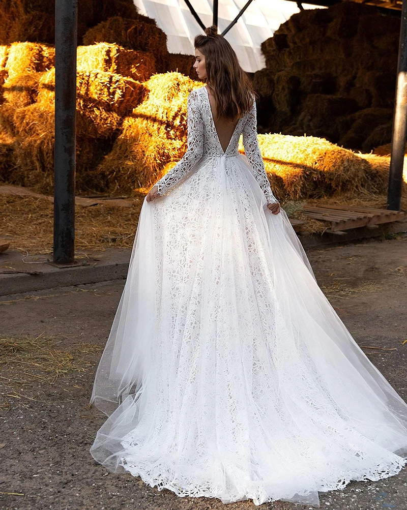 Женское свадебное платье с длинным рукавом, кружевное ТРАПЕЦИЕВИДНОЕ ПЛАТЬЕ ИЗ ТЮЛЯ С глубоким вырезом и открытой спиной, платье невесты в стиле бохо, 2021