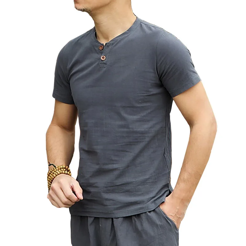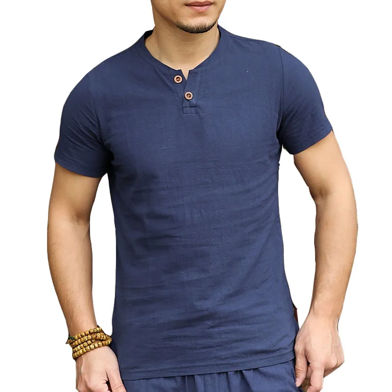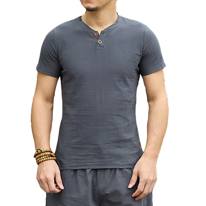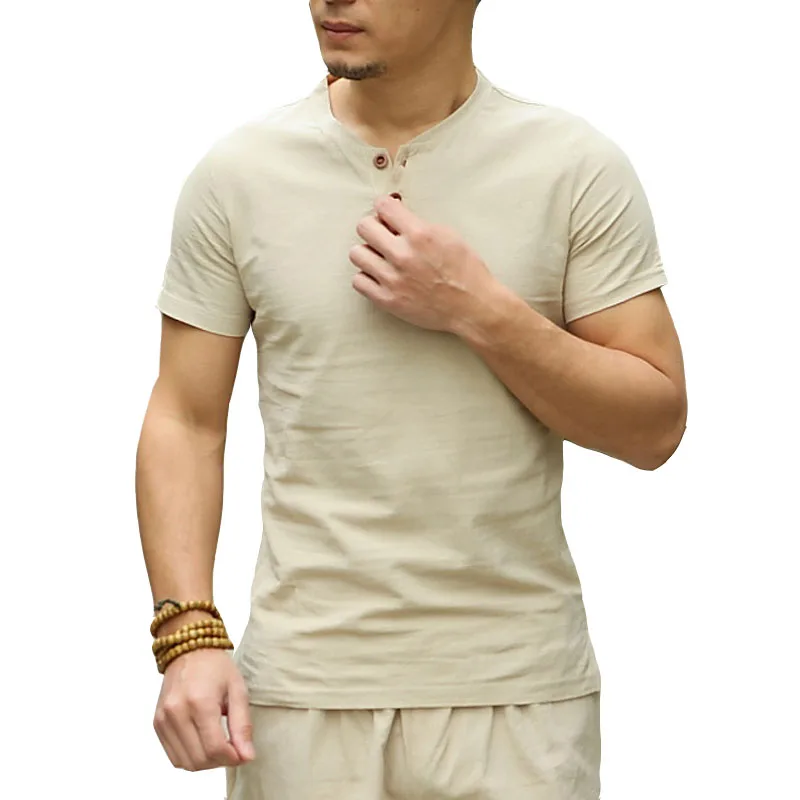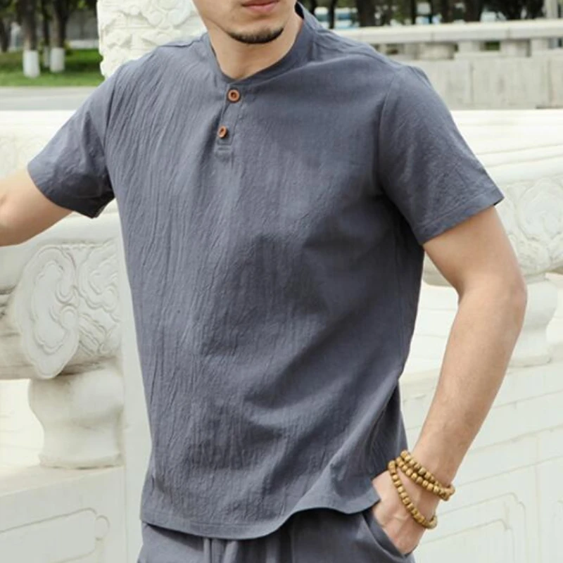 Рубашка мужская из хлопка и льна, удобная Базовая рубашка с воротником-стойкой, короткими рукавами, на пуговицах, в стиле ретро