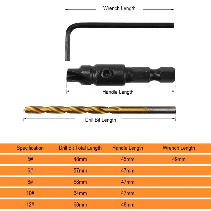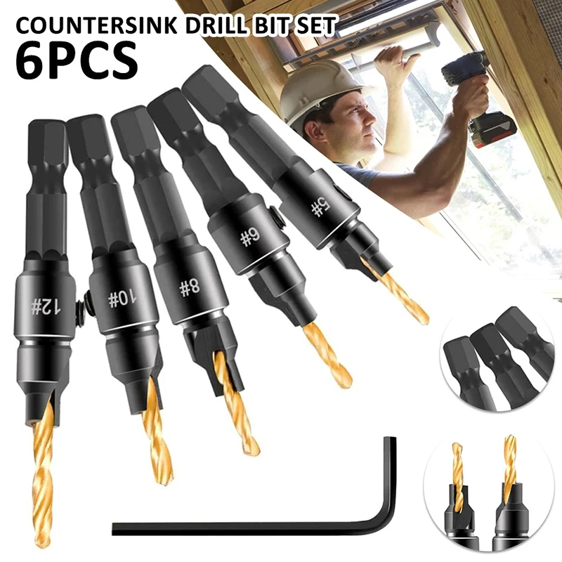 Набор сверл для зенковки, комплект из 6 насадок с шестигранным хвостовиком для работ по дереву, #5 #6 #8 #10 #12