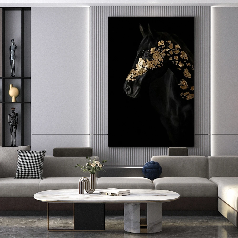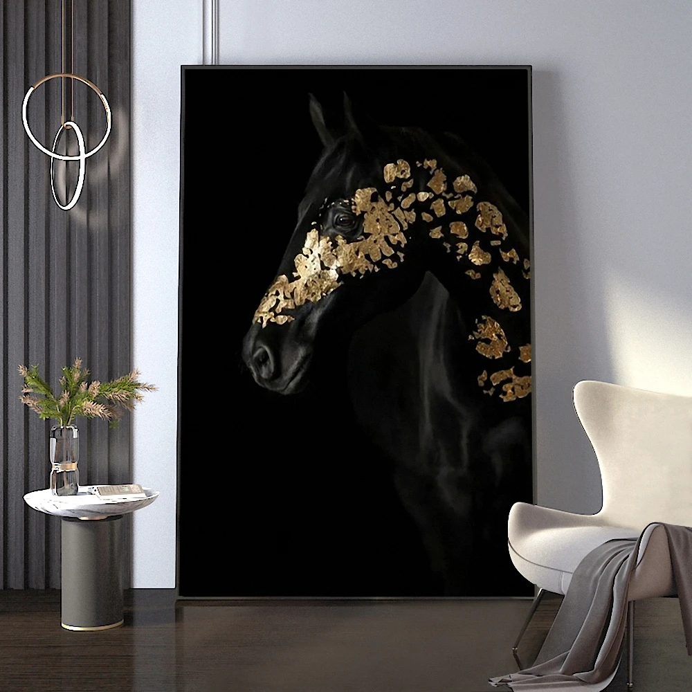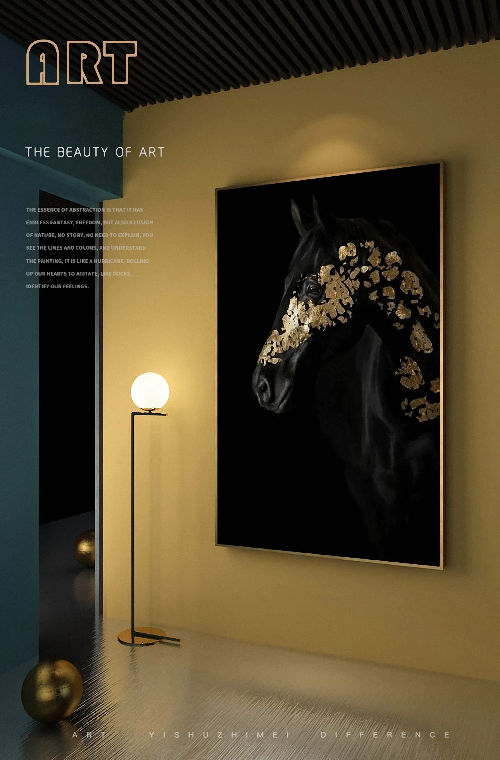 Современная роскошная Настенная картина с изображением черного золота лошади, Картина на холсте с изображением золотых листьев, постер с животными для гостиной, домашний декор