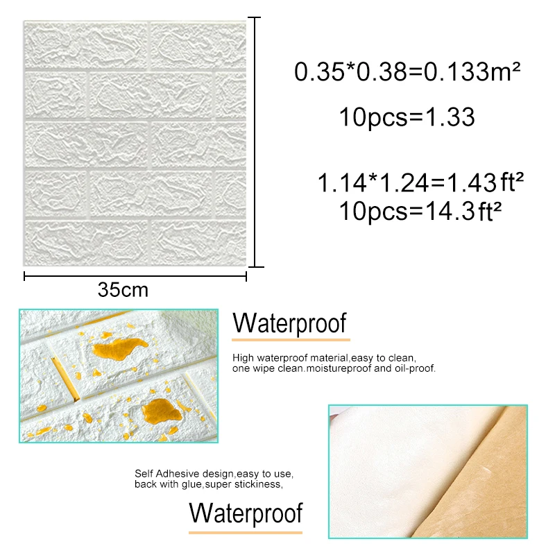Особенности:<Материал: Изготовлен из высококачественного пенопласта XPE, не токсичен, не имеет запаха, водонепроницаем и предотвращающим столкновения.<3D эффект кирпича: трехмерное мягкое украшение из пеноматериала XPE, яркий рисунок кирпича, предотвращение столкновений, Безопасность и защита окружающей среды, хорошее украшение стен для вашей комнаты.<Анти-столкновение: XPE пенопластовая бумага-это анти-столкновение, хороший эффект Анти-столкновения и может защитить детей, защитить безопасность семьи.<Самоклеющиеся: с задней клейкой, вы просто пилите и приклеиваете, без других инструментов, без клея, вы можете легко и быстро установить.<Сделай Сам: сделай сам, легко режь и обрежь, без клея, без специальных инструментов.<Водонепроницаемость: XPE поролоновые обои с полиэтиленовым покрытием, которые являются водонепроницаемыми и влагозащищенными, легко моются и поддерживаются, просто протирайте тканью.<Широко используется: Может использоваться для характерных стен, грязных стен, детских комнат, спален, гостиных, столовых, ТВ-стен, диванов, офисных настенных украшений и так далее.<Поверхность: подходит для гладких, плоских и сухих поверхностей.<Легко установить:1. Измерьте стену, чтобы получить подробные размеры перед резкой.2. Очистите пыль перед установкой.3. Обрежьте подходящий размер в соответствии с декоративной областью.4. Оторвите наклейку на спине, затем Наклейте на поверхность.5. Нажмите на обои, чтобы убедиться, что они правильно прилипают к стене.