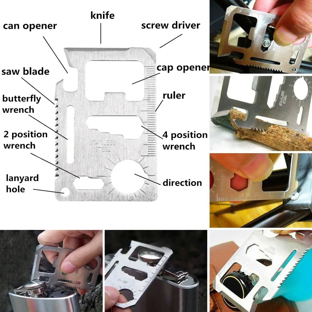 10. Нож для кредитных карт: Размер кредитной карты, легко помещается внутри кошелька, кармана. [11 функций] консервный нож, открывалка для бутылок, 4-позиционный ключ, дюймовый стандарт, 2-х позиционный Выключатель Ключ, дюймовый стандарт, барашковый винт ключ, дюймовый стандарт, направление, вспомогательные ключ, дюймовый стандарт.
