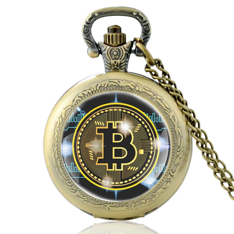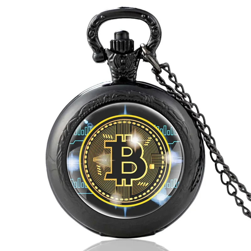Черный классический дизайн биткоина, стеклянный кабошон, кварцевые карманные часы, Винтажный Мужской и женский кулон, ожерелье, часы, подарки