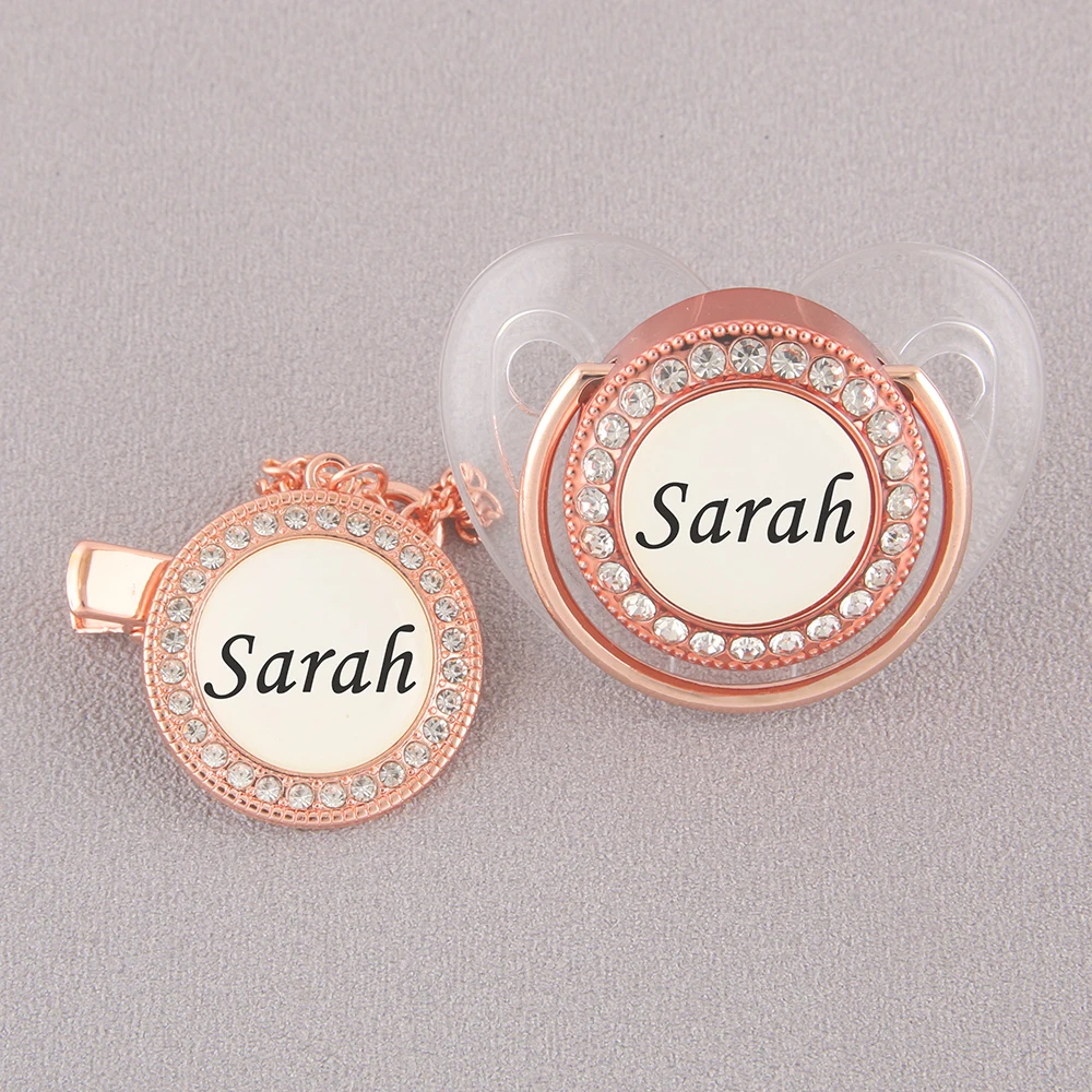 Роскошные розовые Золотые Персонализированные Имя Логотип детские соски с зажимами Стразы Ортодонтическая Соска для младенцев BPA бесплатно силиконовые соски