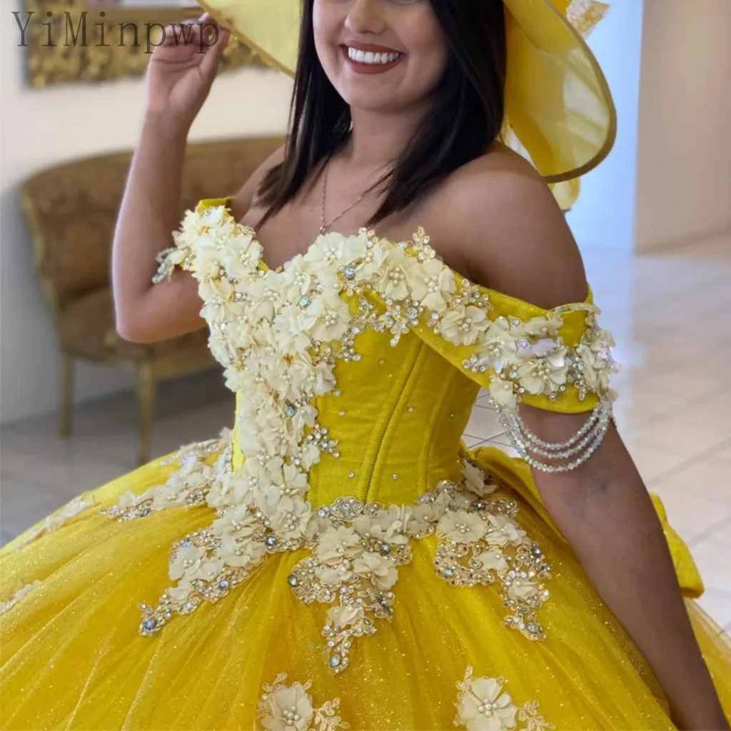 YiMinpwp жёлтое бальное платье, платья с открытыми плечами, со шнуровкой сзади, со шлейфом, с блестками, 3D цветочные платья