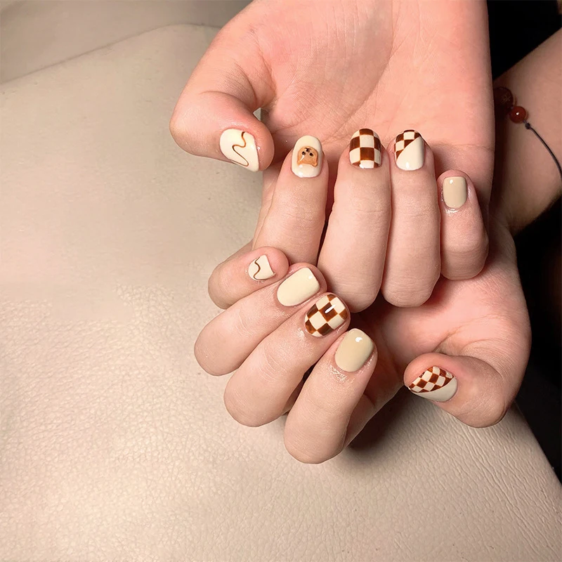Шахматные съемные короткие круглые накладные ногти, искусство с клеем, зимние акриловые накладные Типсы для маникюра, новинка 2021