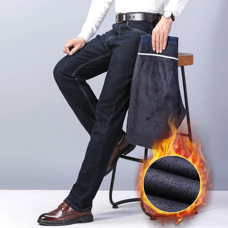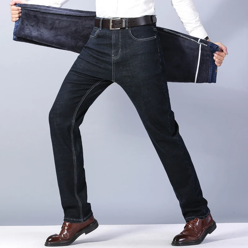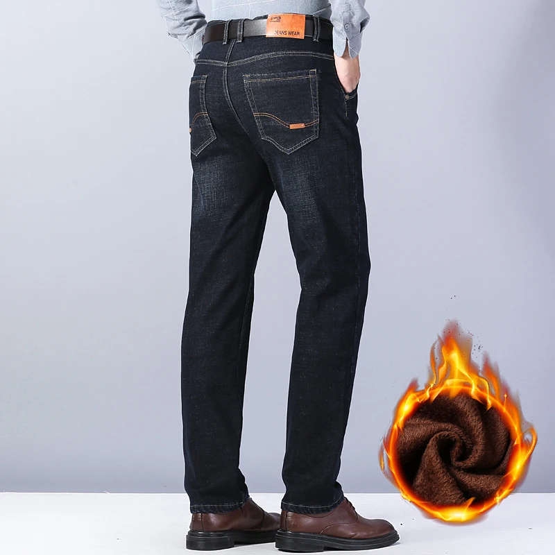 Джинсы мужские, на флисе, зимние, теплые, стрейчевые, прямые, хлопк...