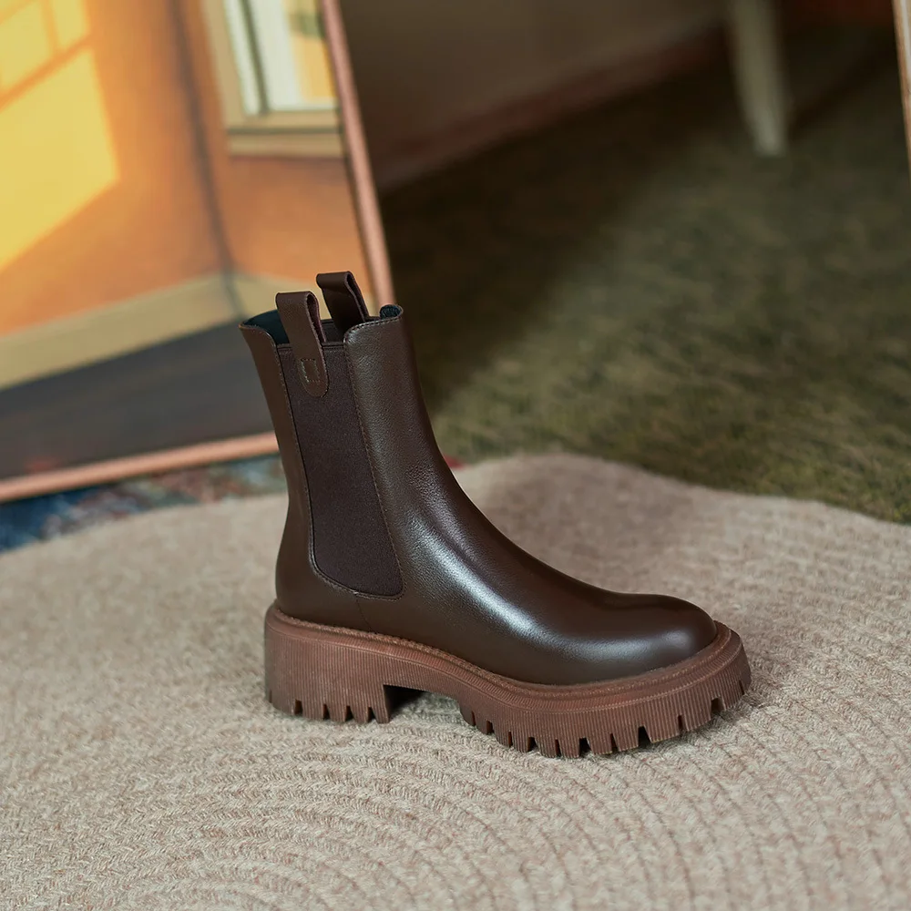 Женские кожаные ботинки челси на платформе, коричневые короткие бот...