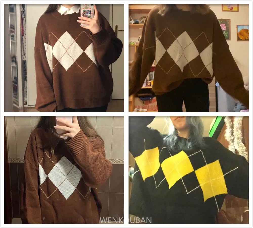 Пуловер женский зимний, свободный, в клетку, с узором ромбиками, 16691