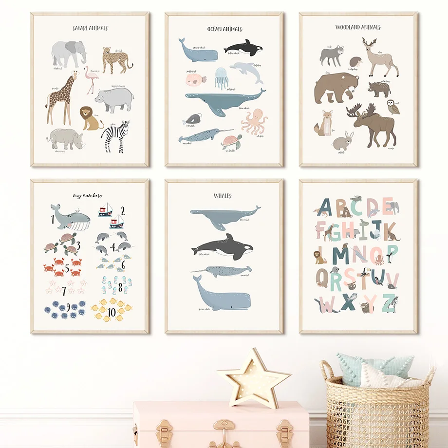 Океанические животные кит Алфавит цифры настенная живопись холст скандинавские плакаты и принты настенные картинки для детской комнаты декор