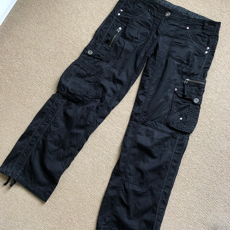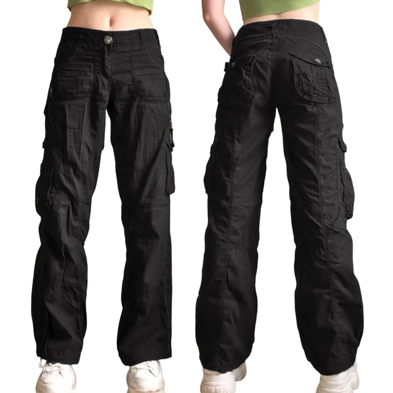 Черные брюки-карго y2k в стиле Харадзюку, с низкой талией, на молнии, с карманами, с рюшами, прямые брюки, панк, мешковатые, ретро, женские спортивные брюки
