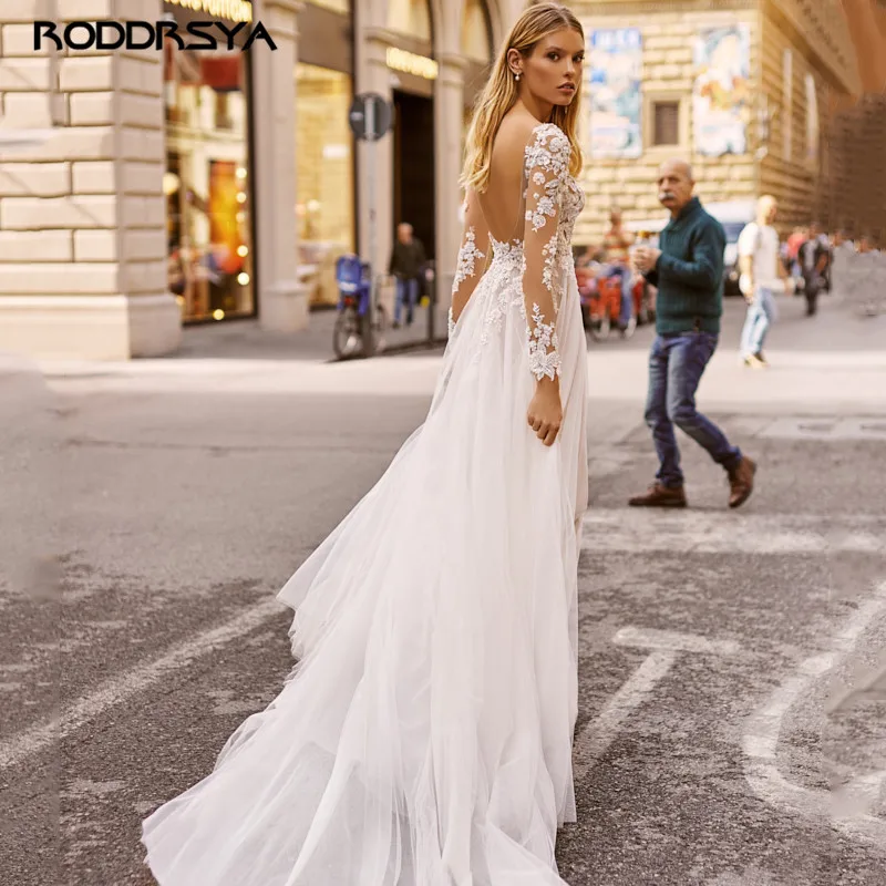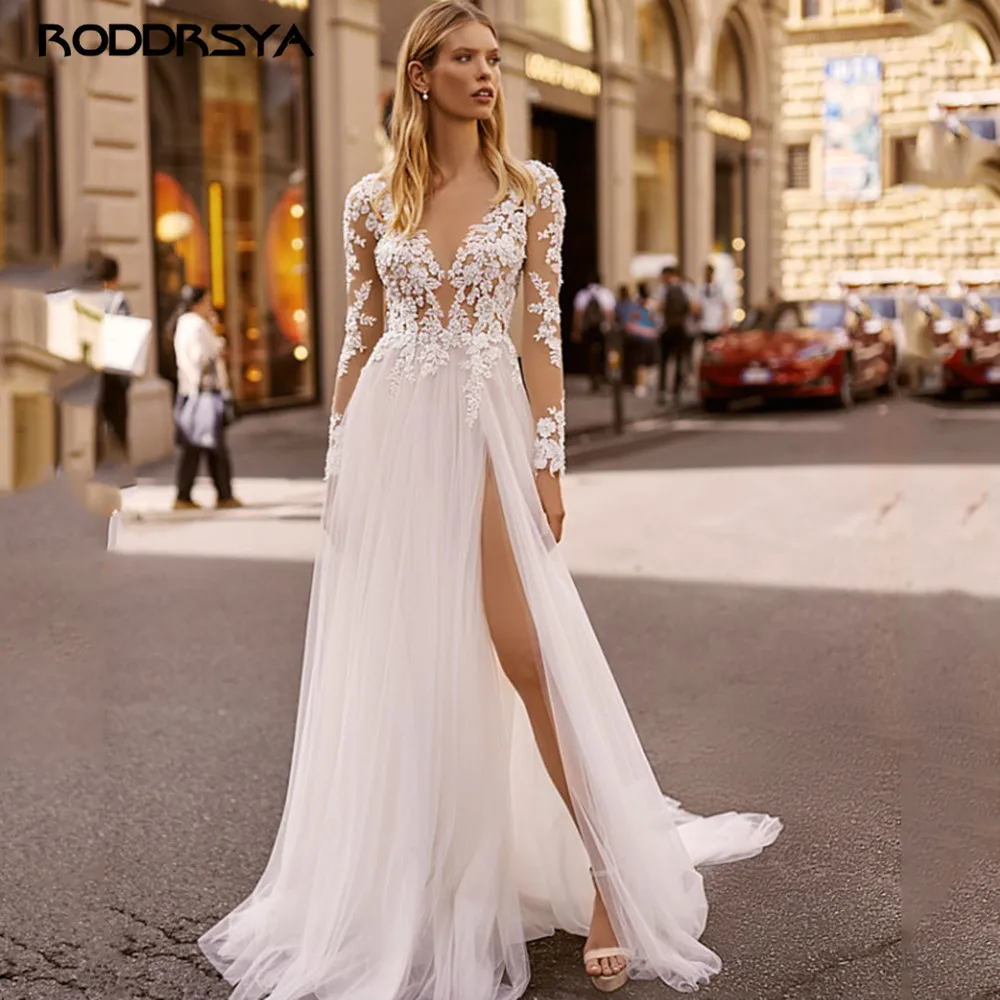 Свадебные платья RODDRSYA в стиле бохо, пикантное винтажное платье невесты с кружевной аппликацией и V-образным вырезом, с Боковым Разрезом, ТРАПЕЦИЕВИДНОЕ Тюлевое с длинным рукавом и шлейфом