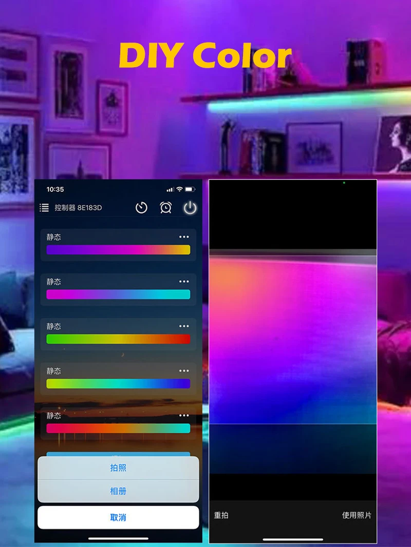 1. Мобильный телефон может использовать приложение для управления и регулировки цвета и яркости полосы светильник через smart bluetooth