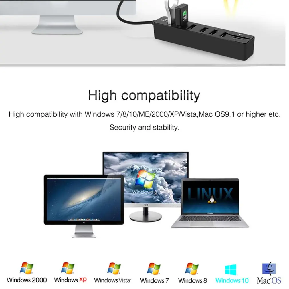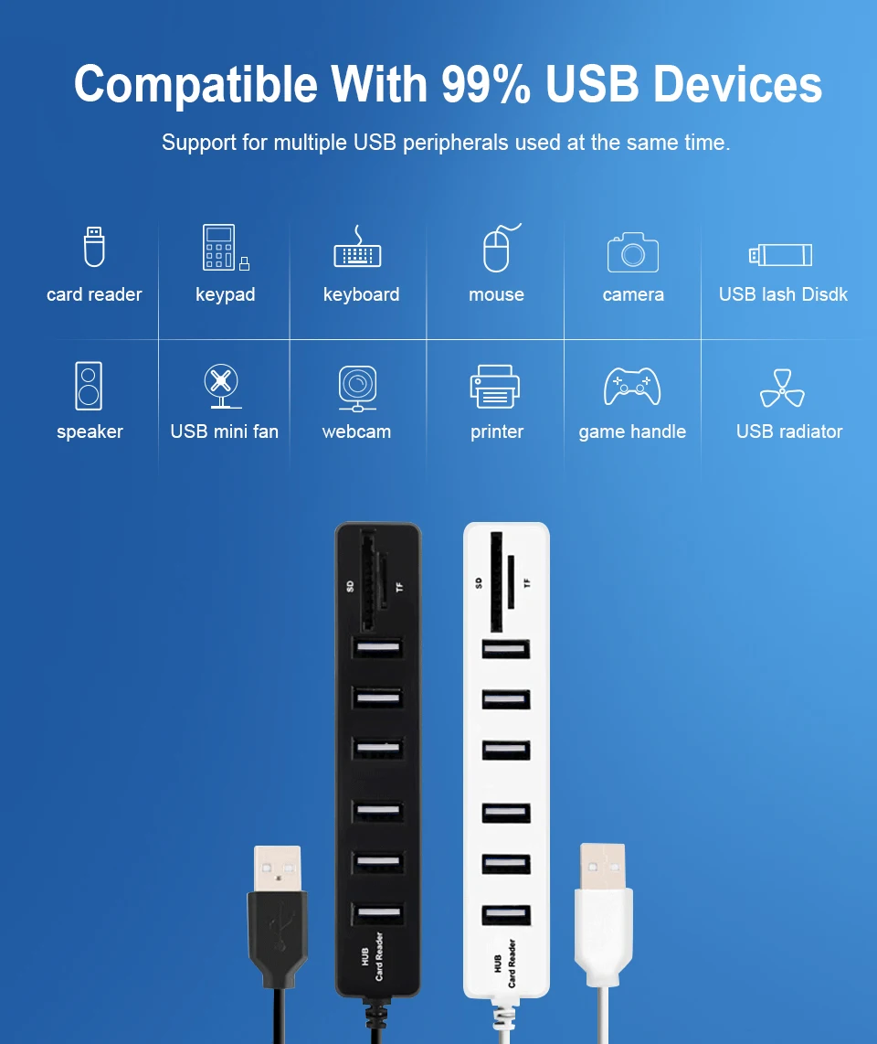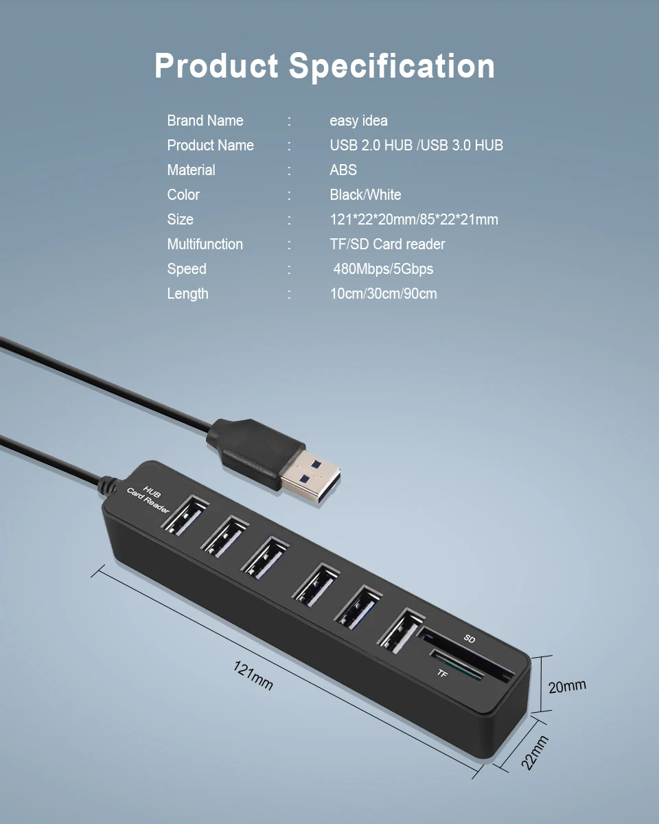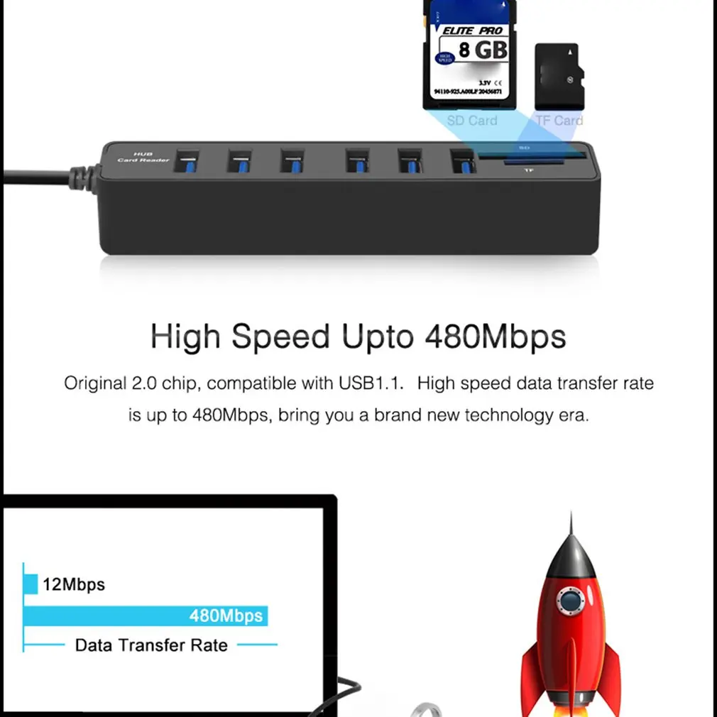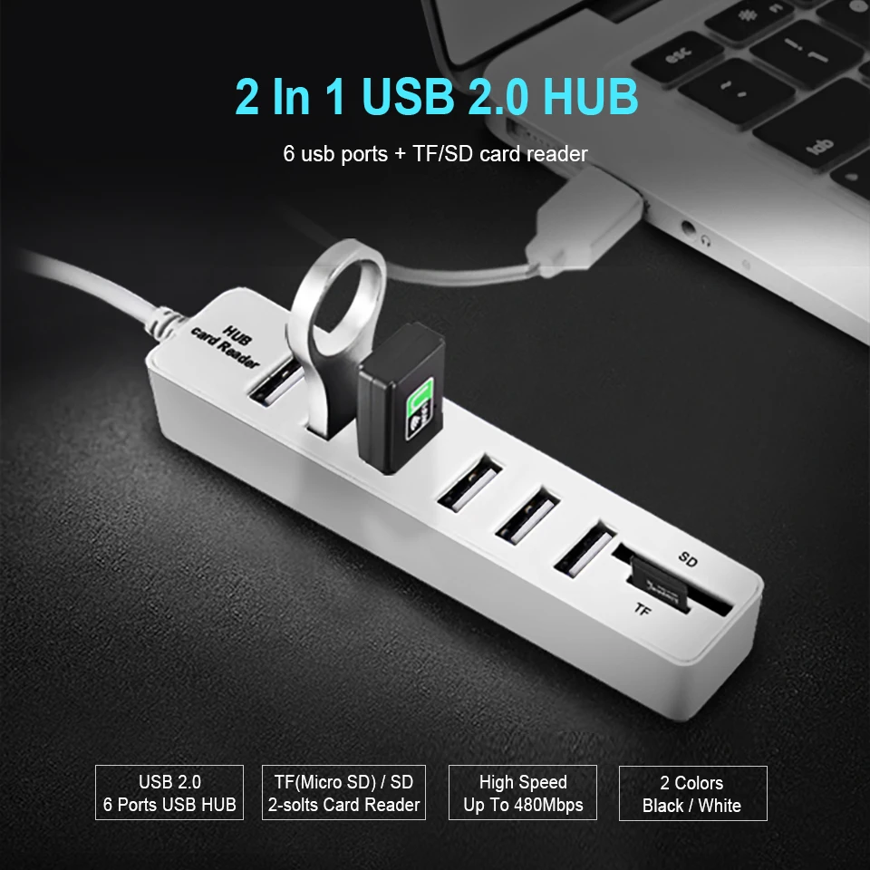Характеристики:Тип USB: USB 2,0Скорость передачи данных: до 480 Мбит/с (60 МБ/с.)Usb-порты: 6 портовКард-ридер: для SD/TF(Micro SD) картыКабель Длина: около 0,9 м/3FTРазмер: 121D * 22W * 20H ммЦвет: белый/черныйМатериал: корпус из АБС-пластикаМощность: 5 В/500 мАСовместимость: Windows XP/2000/Vista/WIN 7/8/8.1/10,Mac OS и т. д.Посылка включает в себя:USB 2,0-1 шт. концентратор с SD/TF кардридером